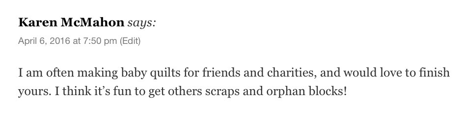 Congratulations, Karen!! I’m sure you’ll put the blocks to good use. And don’t you just LOVE the little bonus quilt??
