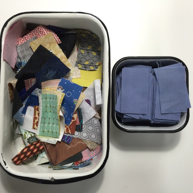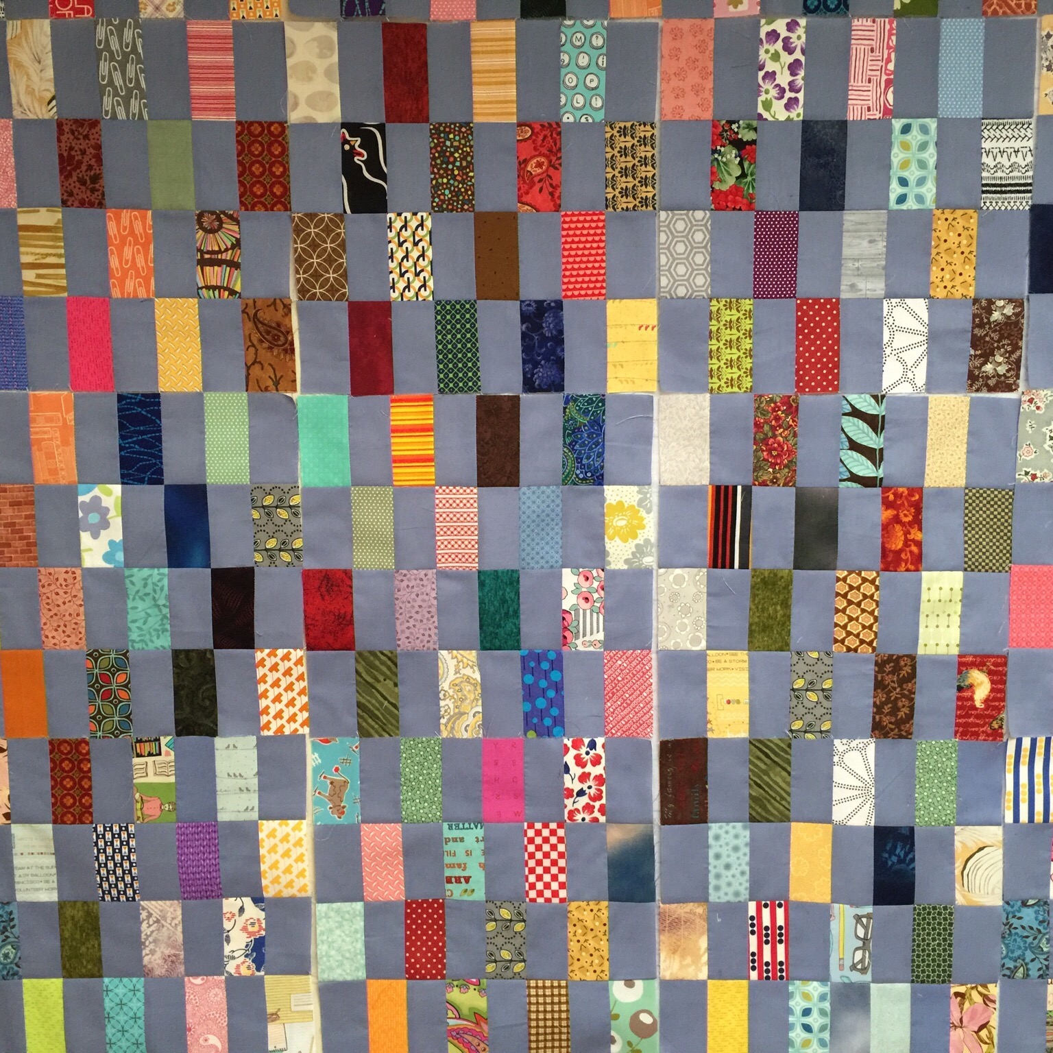 I was almost completely out of the blue fabric I was using for the alternate rectangles. The fabric I used has been in my stash for at least 15 years. I cut all of it up for this and thought I had just enough. I had half enough! So I made a little trip to my local JoAnn’s. Not a place I love to shop, but I was sure that is where I bought this blue originally. This is what I found: