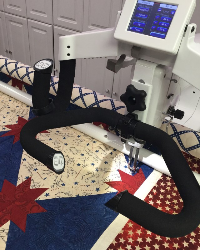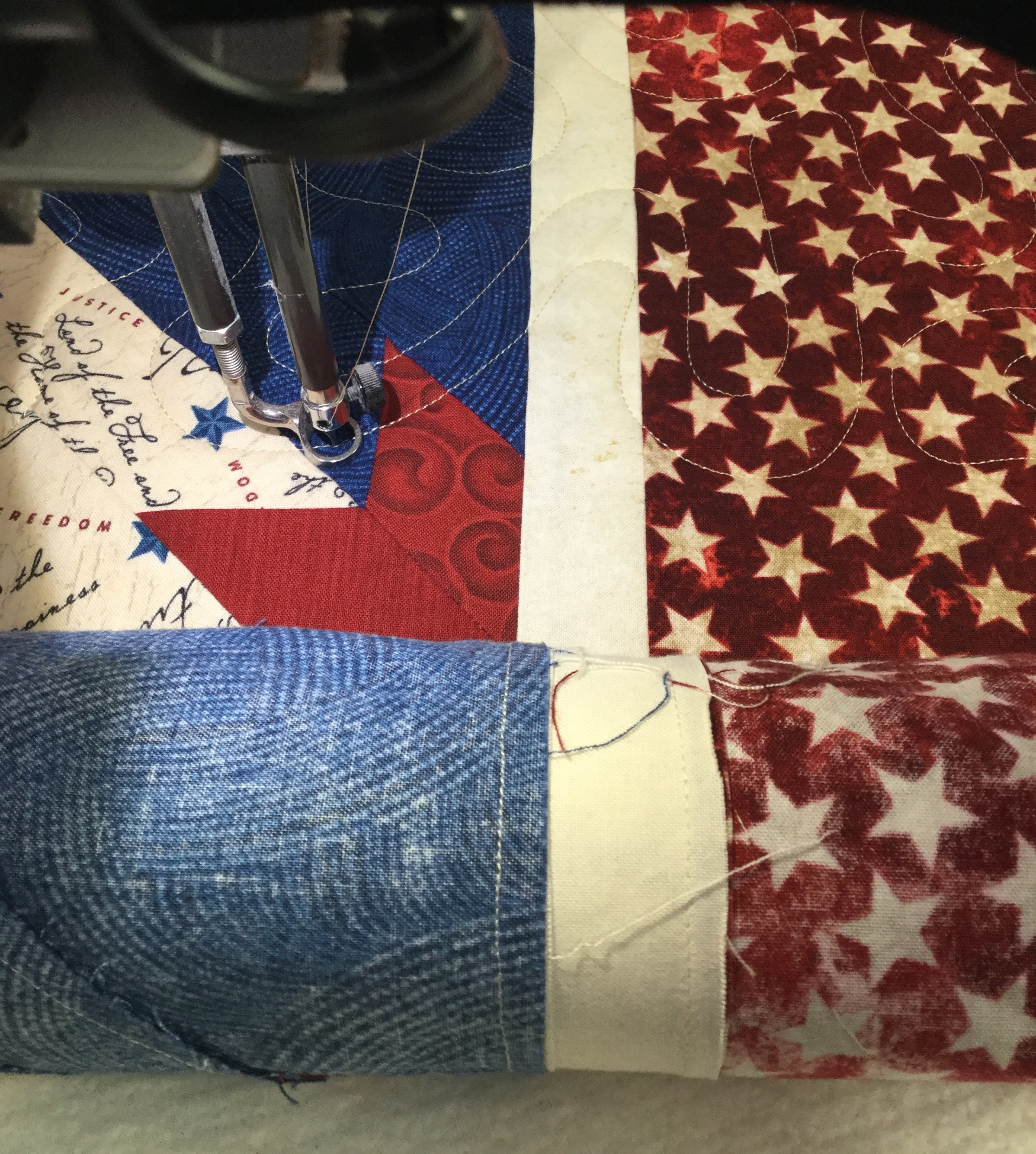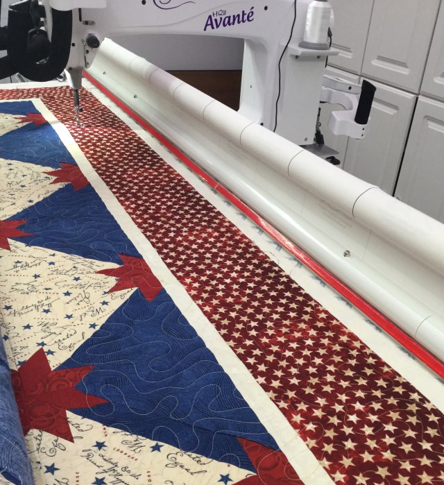 I’ve been quilting lots of pantographs lately. I thought I would share a bit about how they are used and how I space the rows of the design. This first pictures shows a Quilt of Valor loaded and ready for quilting.