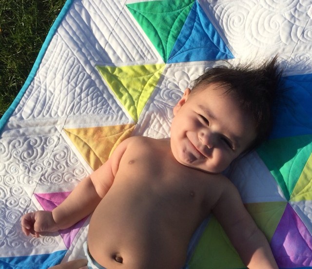 Little E could melt any heart with that cute little smile! That quilt reminds me of summers at the beach….good times..