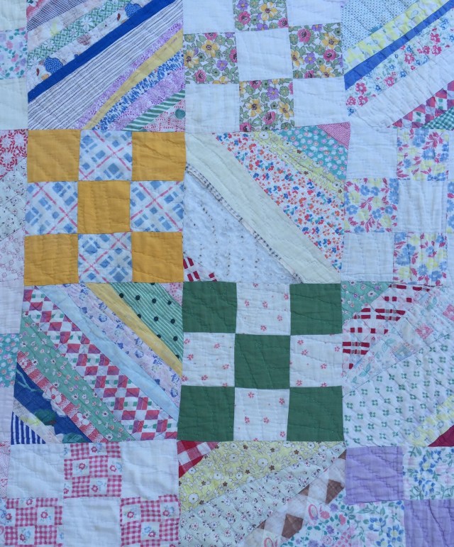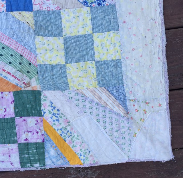 Quilts like these are so precious. I brought one home yesterday made by my b-I-l’s grandmother and it has the same worn through look in some places. I’ve been asked to try to repair it but I’m not sure it’s possible. I love the simplicity of the patterns and the fabrics in older quilts. I can just feel the peace of ‘simpler times’ when I touch one of them. Does that sound dorky?
