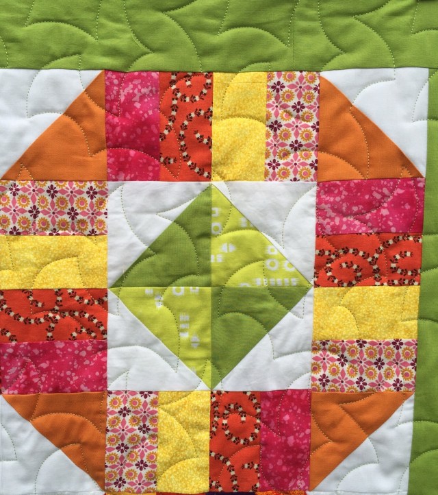 This one really shows that using simple shapes can result in an amazing quilt….love the colors, and that backing fabric is beautiful, too!