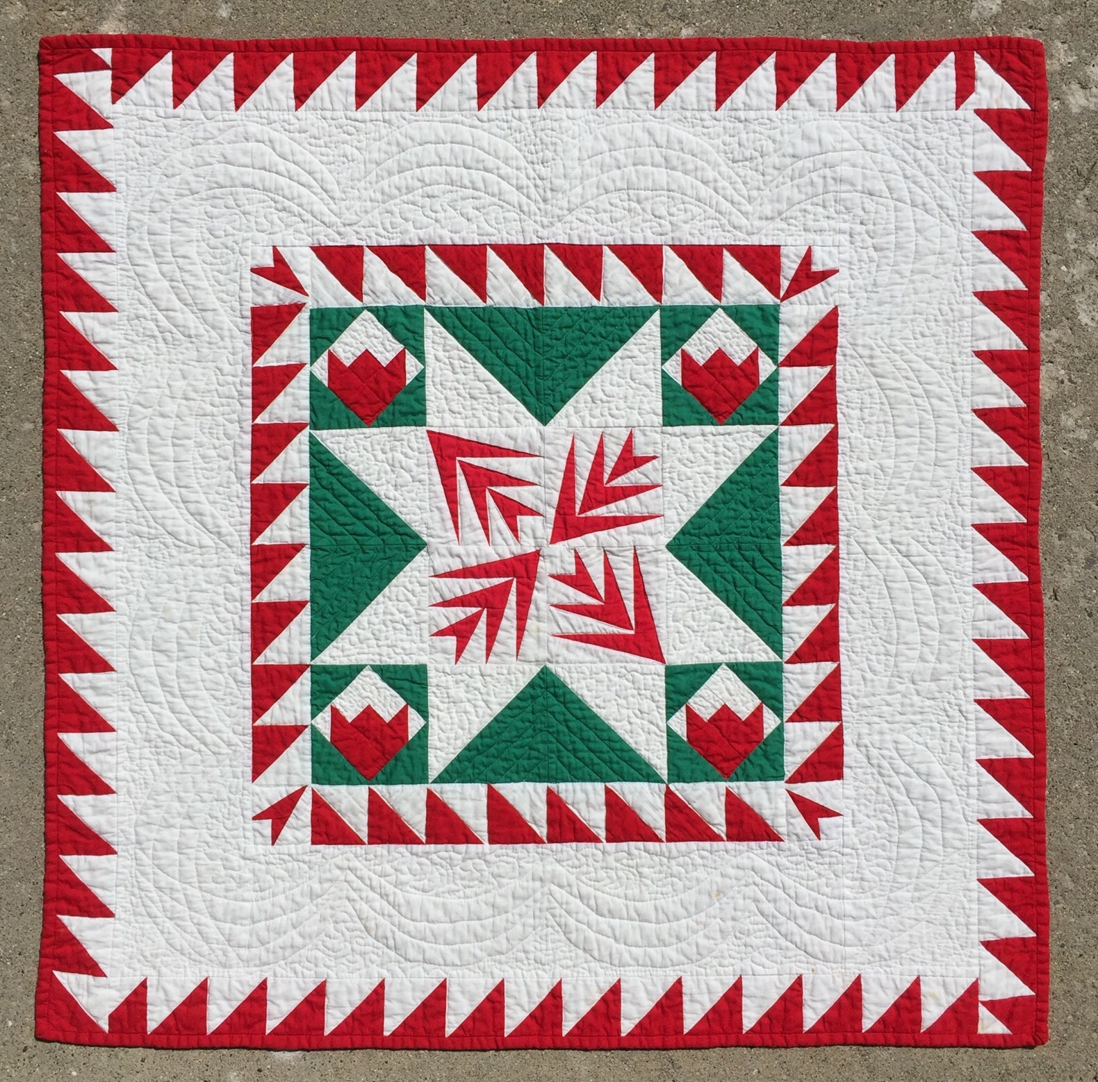 I remember so clearly working on this little quilt! I was so pleased with how precise everything was turning out. I made my HSTs for the outer border, added the white border and, WHAT????!?!?!?! I cut the white border wrong! I was so upset I had to walk away. I went to get the mail and my copy of Ladies Circle Patchwork Quilts had arrived. I turned to Gwen’s column and she had written an article about piecing borders and chopping off what didn’t fit. It was a light bulb moment for me. She said this was the way women had worked for years and it wasn’t necessarily wrong. I went back to my little top, measured my HST borders and chopped off the extra.