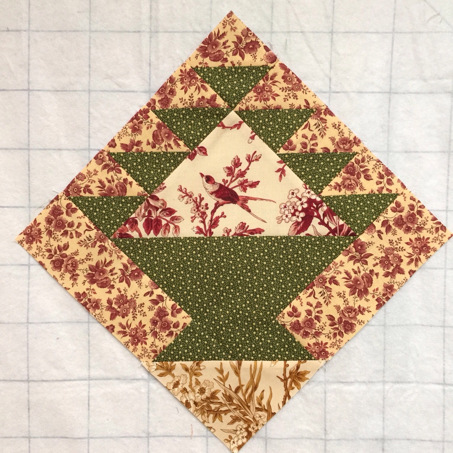 Have you started on your basket for our little QAL? I hope so! I confess, I didn’t work on it much this week. With graduation, moving my daughter, and work, not a lot got done. But I have been thinking about it! I love basket quilts, but since I try to avoid the A word (applique), I felt a little stumped. I didn’t want an empty basket for the middle of my medallion. Then I decided to put a print there. I made this block: