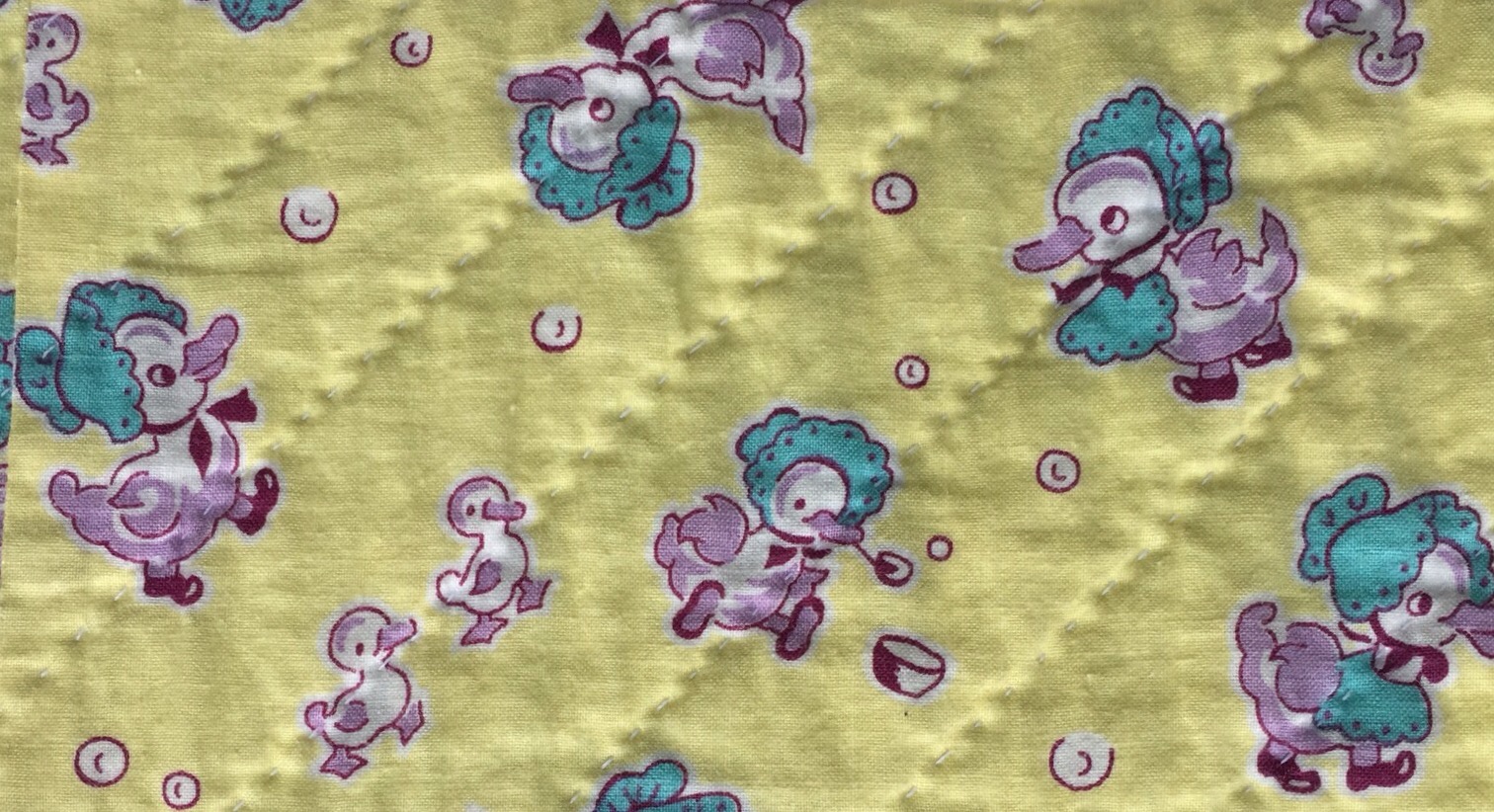 I hand quilted this. I just love this sashing fabric. See the little duck blowing bubbles?