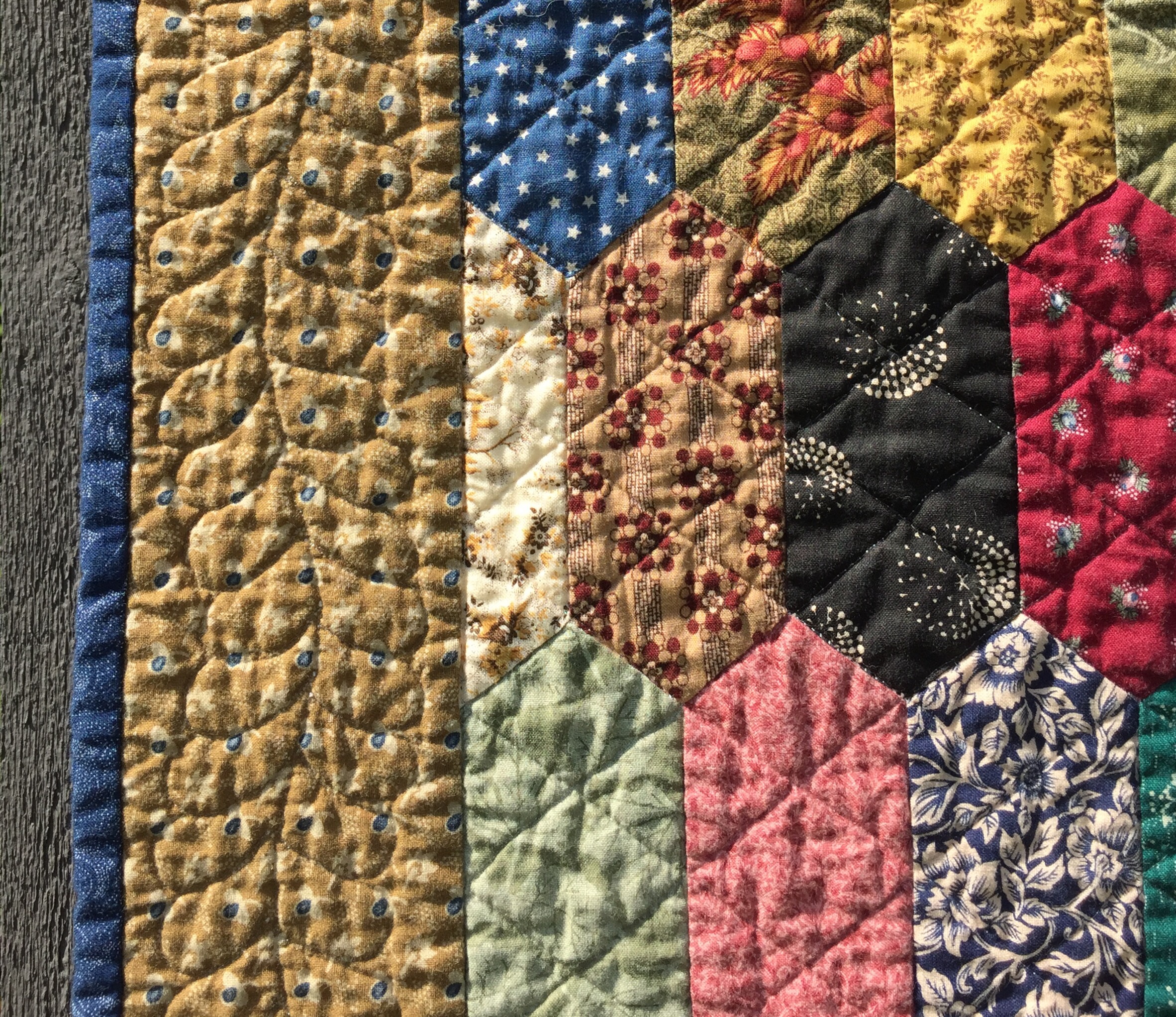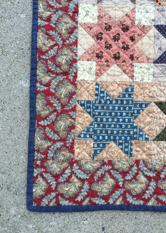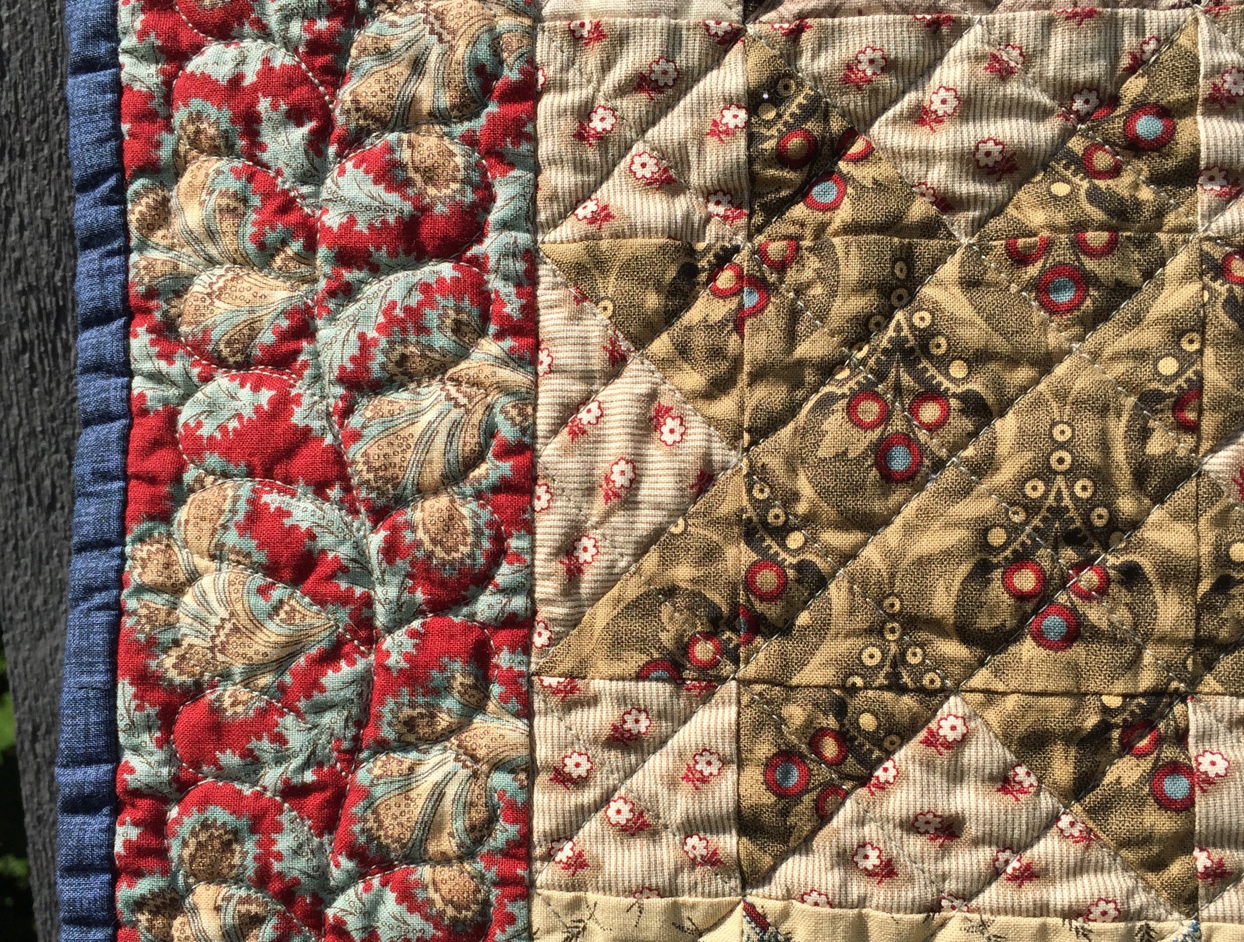 Love both of these quilts!! Civil War Repro fabrics are my favorites! The elongated hexie quilt is great…but I really, really like those stars!! The border fabric on that one just pulls everything together!! And the quilting is great on each quilt! Thanks so much for sharing!!
