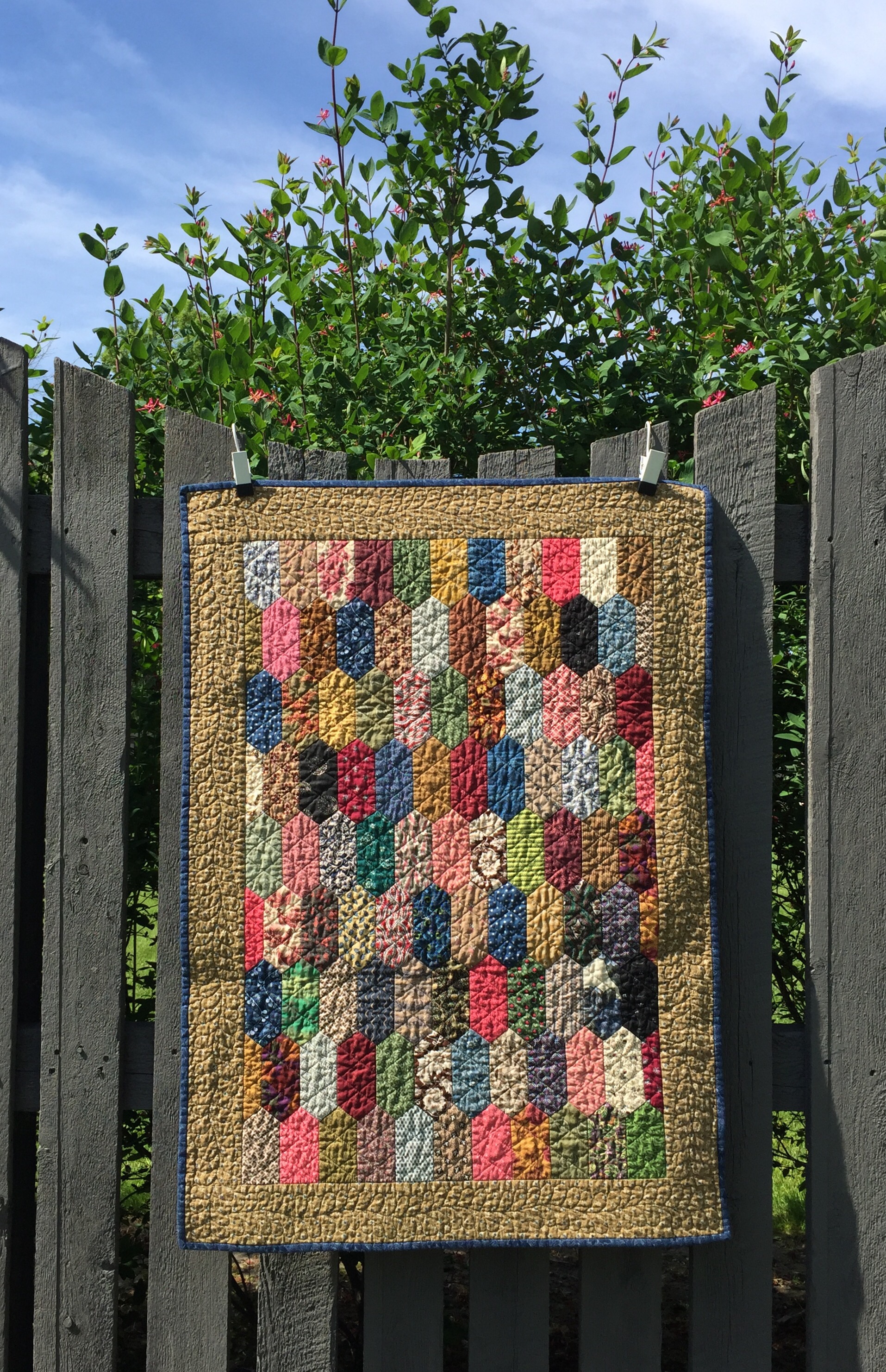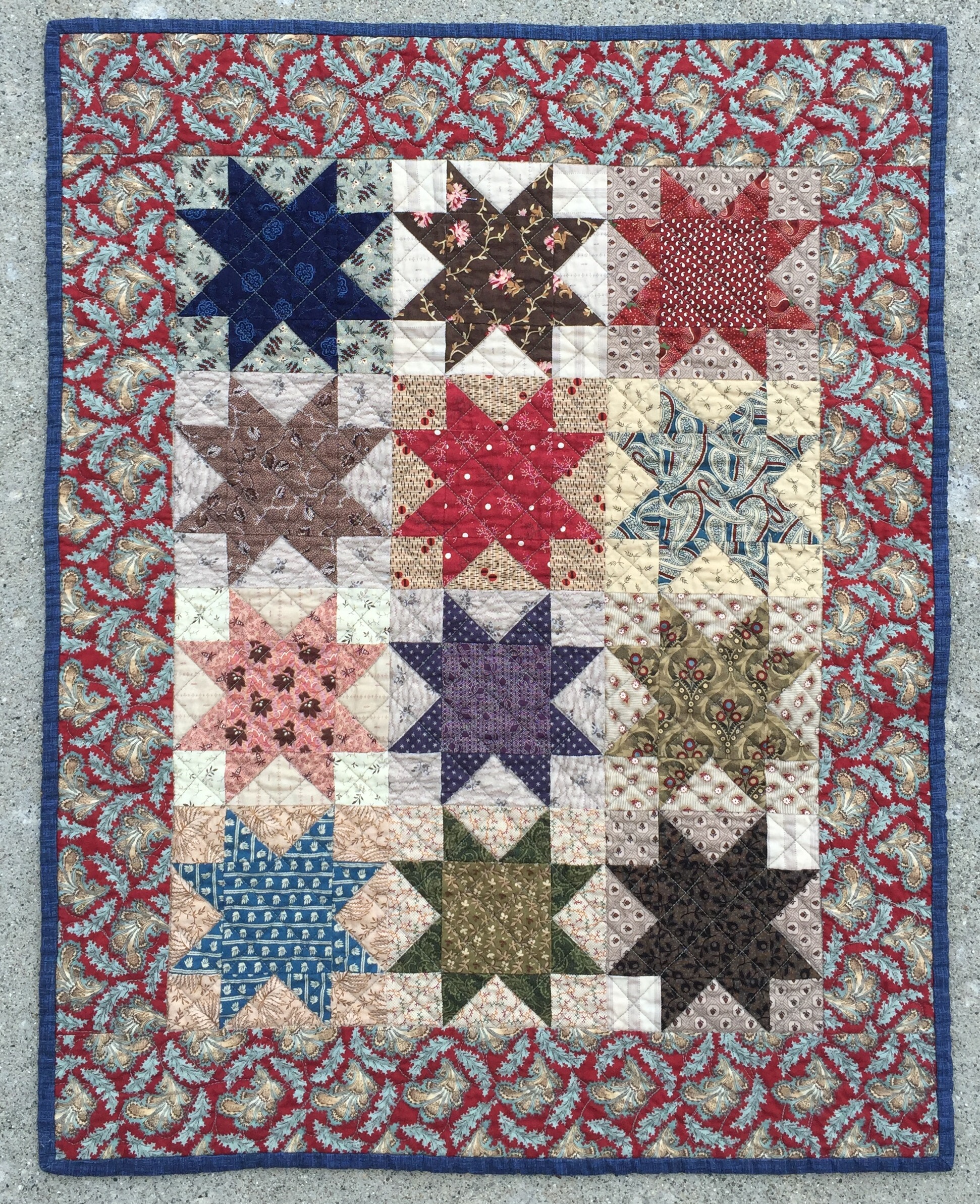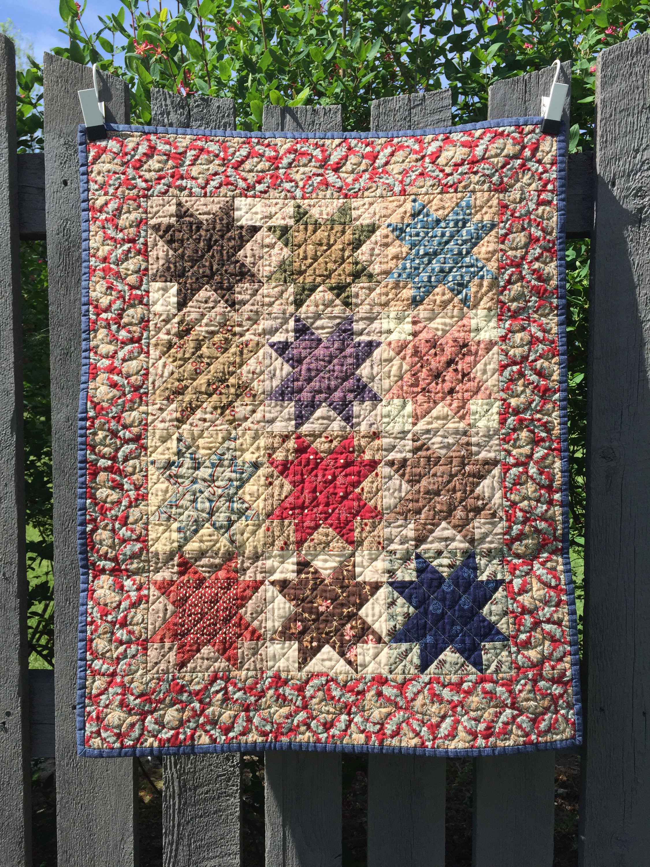 Love both of these quilts!! Civil War Repro fabrics are my favorites! The elongated hexie quilt is great…but I really, really like those stars!! The border fabric on that one just pulls everything together!! And the quilting is great on each quilt! Thanks so much for sharing!!