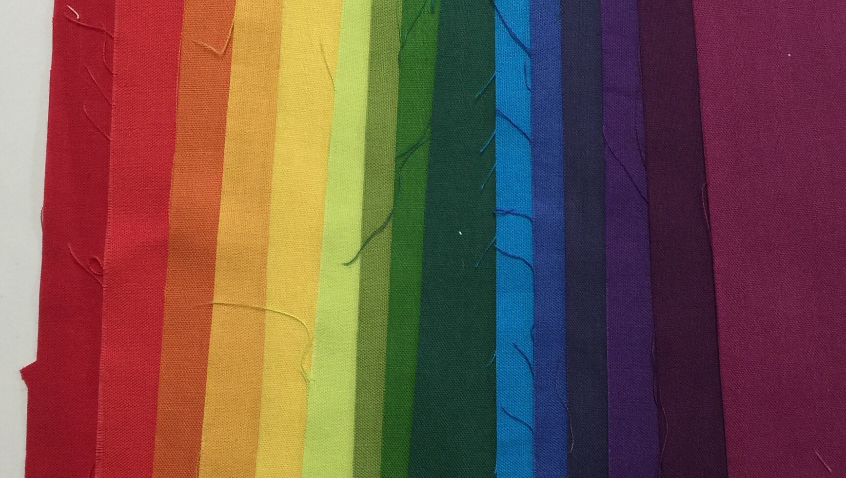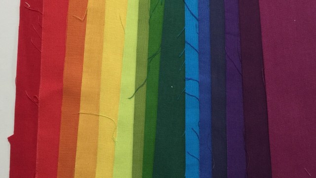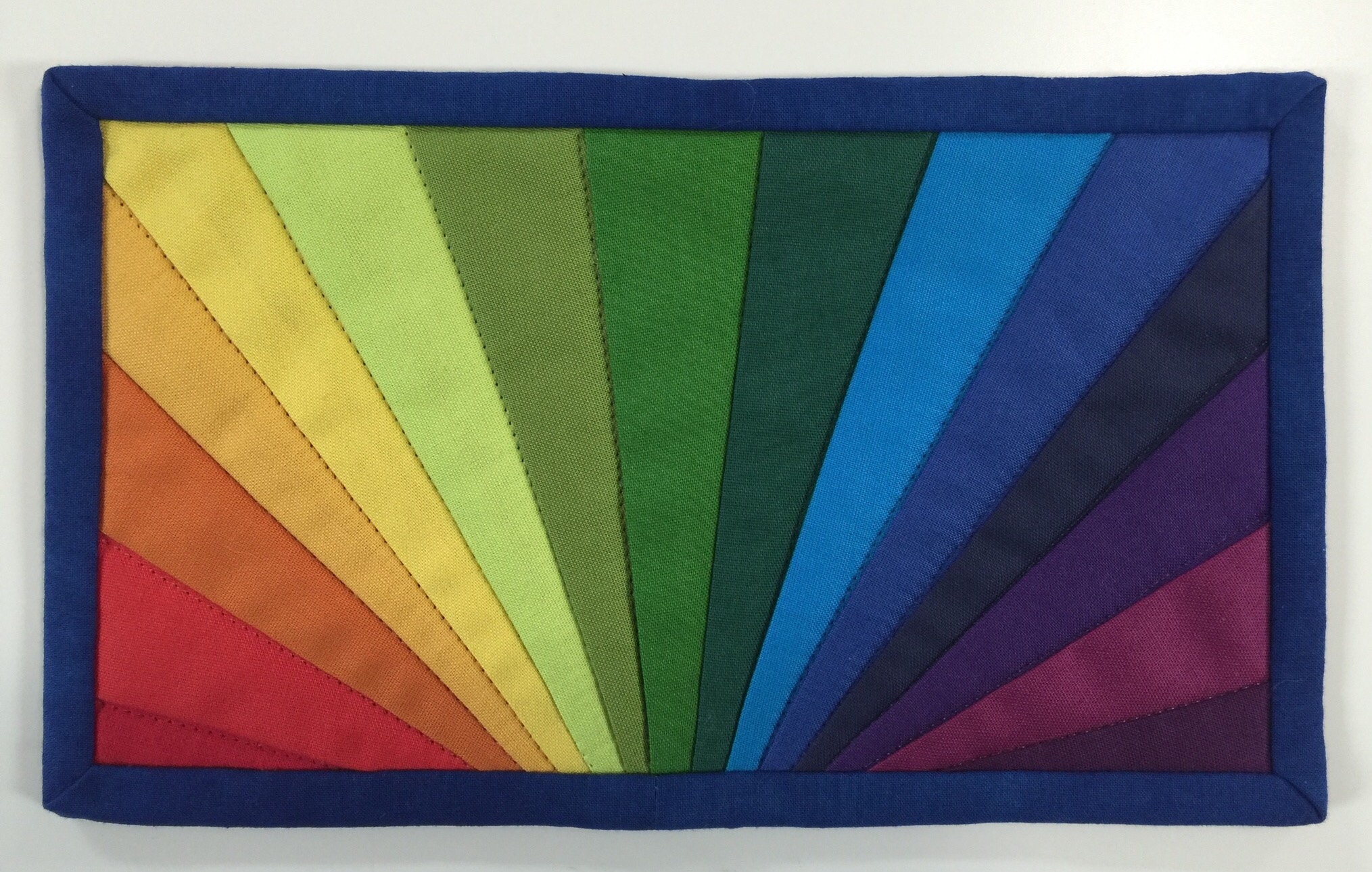 Your rainbow mug rug reminds me of a workshop I took with Caryl Bryer Fallert (now Fallert-Gentry) — gee, must’ve been in 2001. The supply list was to bring 1-1/2″ to 2-1/2″ strips of solids, all colors. She taught us how to arrange the colors in spectrum order and cut and piece back together. That’s not a good explanation, but I made my class sample into a potholder and used it for years!