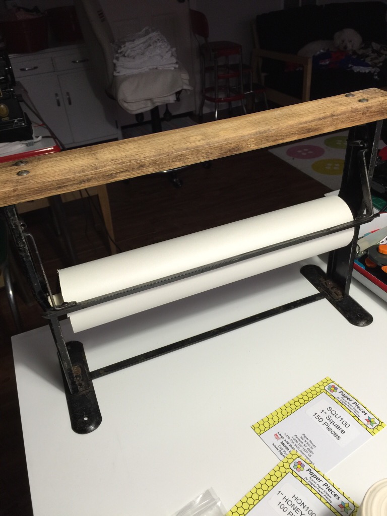 Hubby has a piece of wood that I will mount it to rather than permanently fixing it to my table top. I had a roll of paper from Ikea, but it was too long! Ugh! Well, necessity is the mother of invention, so I wrapped painters tape around the roll in one spot and used a hack saw to cut it down to size. Then I had a small roll that I can use for paper piecing the borders for my Gwennie Inspired QAL Medallion. It was a win-win!