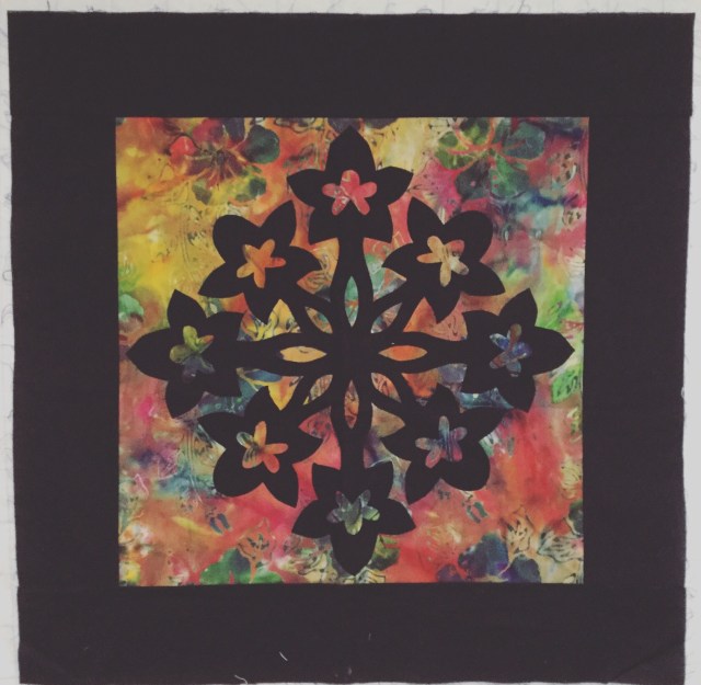 No, I’m not in Hawaii. I am in Arizona! Yay! But Hubby and I did go to Hawaii a few years back with his parents. It was a wonderful trip. I bought some Hawaiian fabric and a book on Hawaiian quilts. Have I ever mentioned how I feel about appliqué? Um, yeah. I cut out exactly one block and fused it to the background with Heat N Bond.