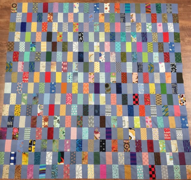 It feels like this has come together very quickly, but in fact, I started cutting scraps for this way back in February. It won’t take long to get the hour glass blocks that I am currently using for leaders/enders done so I need to start thinking about the next one.