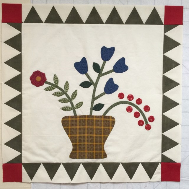 Your little tents are great, and adding the red corner blocks works so well to tie that border to the appliqué center….looking great!