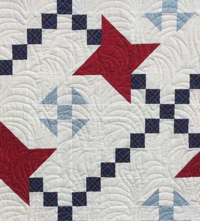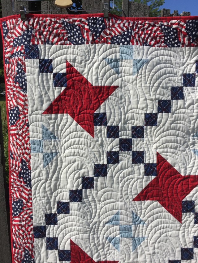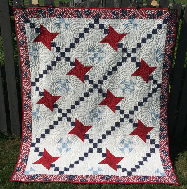 I love this quilt. Some of the patriotic quilts are so over the top stars and stripe fabric. This is beautiful. I love the border, it just brings it so together.