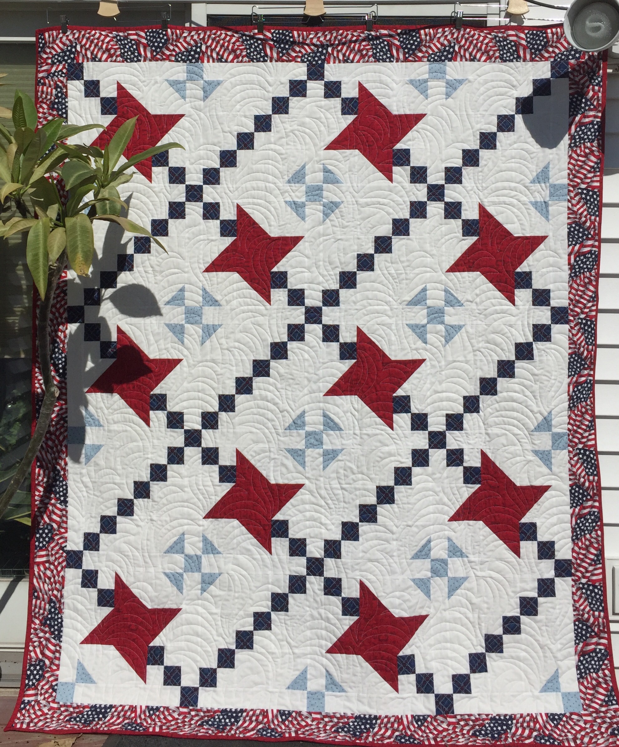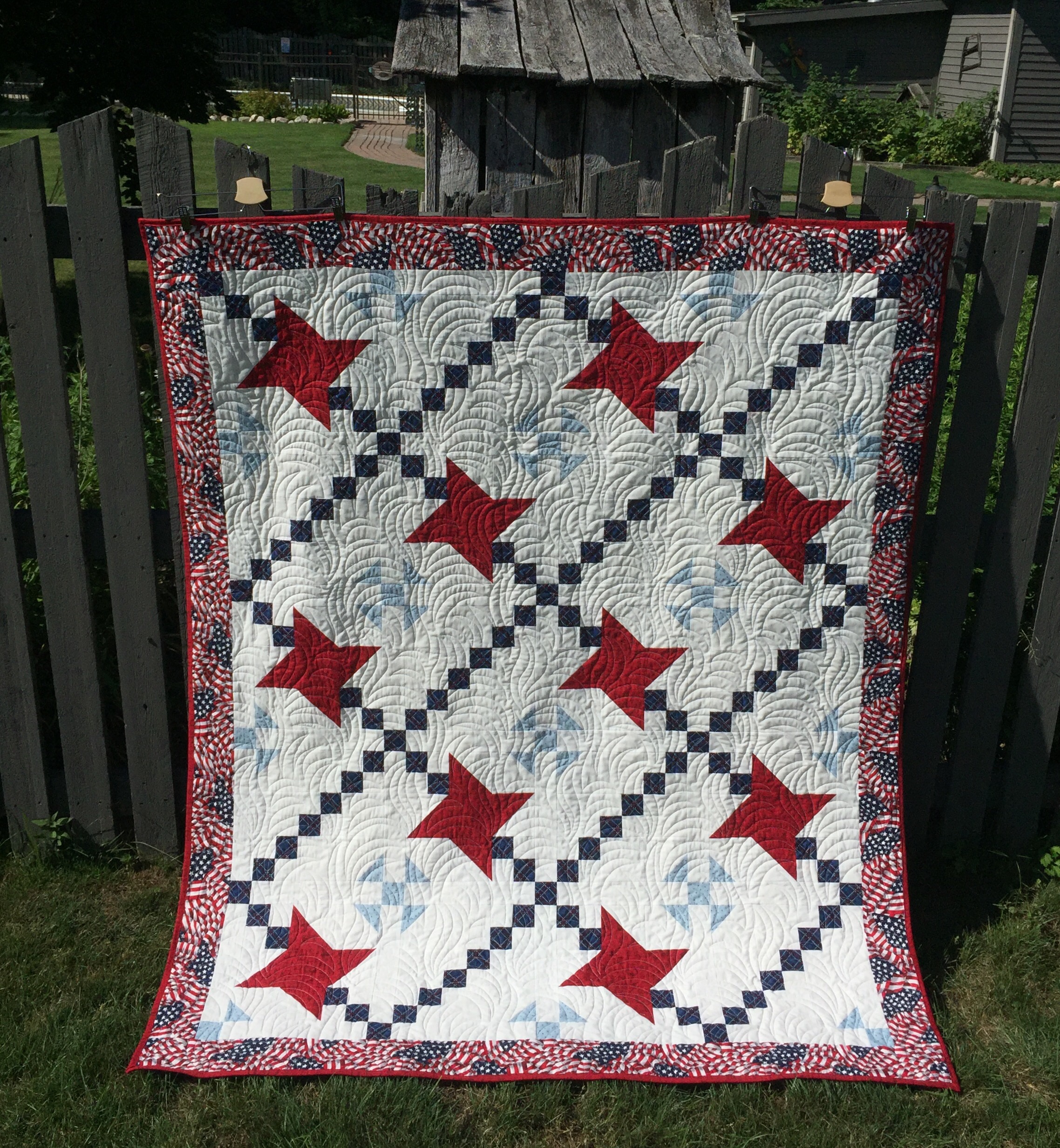 I love this quilt. Some of the patriotic quilts are so over the top stars and stripe fabric. This is beautiful. I love the border, it just brings it so together.