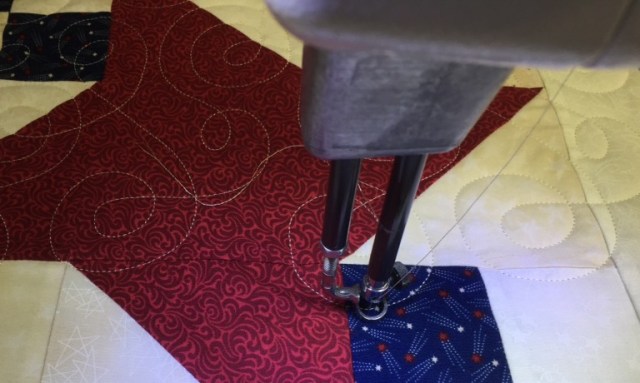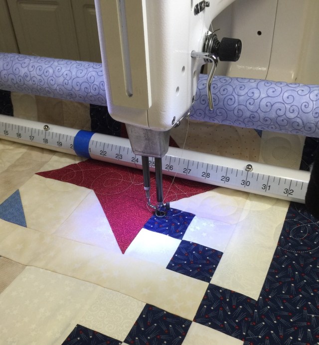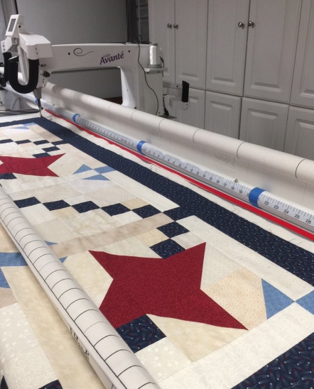 Someone recently asked me how I line up my pantographs for quilting. It’s a bit hard to explain, so I thought I would do a tutorial here. This beautiful top was made by Kathy from our Stitching Sisters QOV group. She also took part in the Mystery Quilts 4 Military that Alycia hosted. I love her top!