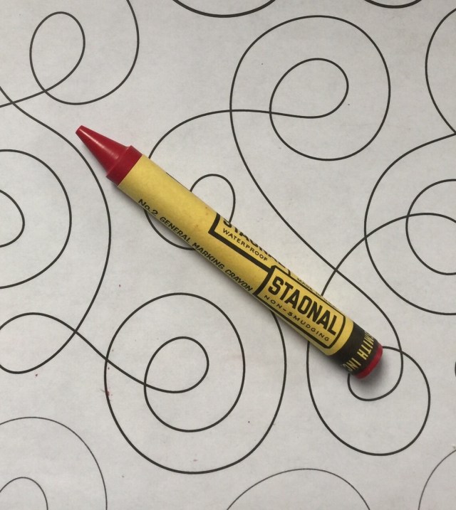 And this crayon is a tool I couldn’t do without when I am quilting with pantographs. I have a plastic covering on the table of my frame and I slide my pantos underneath that. It keeps them flat and I can use this crayon to mark them up. It wipes off with a dry rag when I am done.