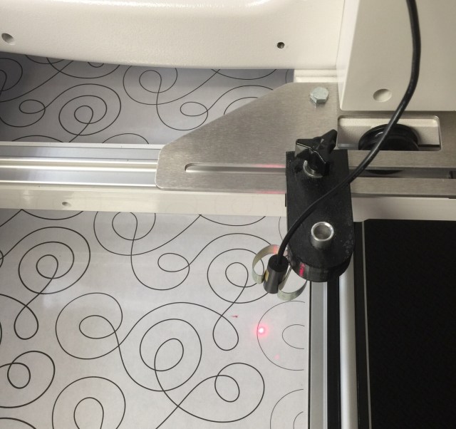 This is the view if you are standing at the back of the machine. That red dot is my laser light and it’s position directly corresponds with the needle on the quilt top. I have used the crayon to draw in a vertical line representing the side of the quilt and a horizontal line representing the top of the quilt. The line is at the bottom of the picture because you are standing at the back of the frame and the top of the quilt is closest to you. Hope that makes sense!