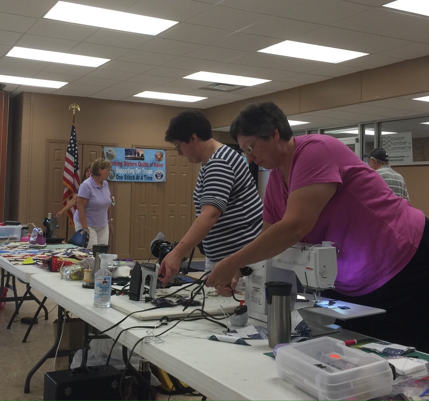 If you have hung around here for any length of time, you have heard me talk about the Stitching Sisters Quilt of Valor group that I am lucky enough to be a part of. They meet once a month for sew days, but since they are about 90 minutes away and I work every other Saturday, I have only gotten down there to sew with them twice! Usually, one of the faithful members of the group attends the meetings and picks up tops for me. Then we meet halfway and she hands them off. When I am done quilting them, we meet up again and she delivers the finished quilts. Last weekend, all things worked out and I was able to go. I had a great time quilting with my friends and we even had a quilt presentation that afternoon. Yay!