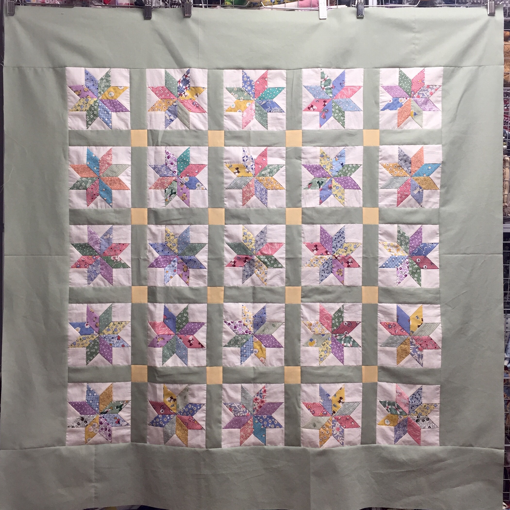 The border fabric for your star blocks is perfect….is that Kona Ash! That is one of my favorites…the yellow cornerstones pull everything together….love this quilt top!