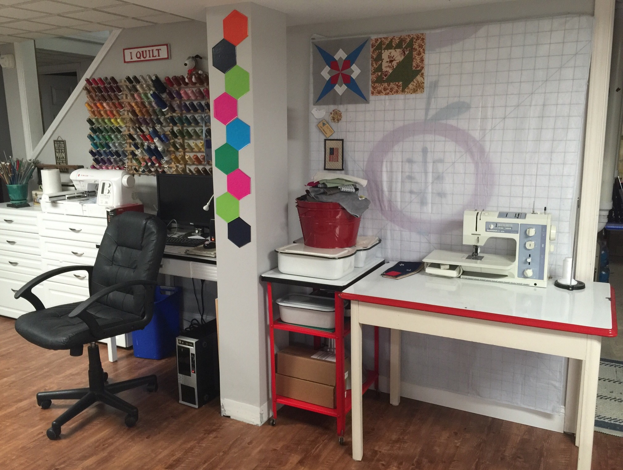 You have some great yard sale finds! I have two 301s and I LOVE them! I also have a pretty sweet 15-90 but the timing is off right now. I love how you have all of your machines dropped in tables. My 15 and one 301 are flat but all my others just sit on a table when I use them. Also, the 301 cabinet is real small, but it is the very cute No. 74 Trapezoid! Design walls are the best. I hope your new setup works for you. Thanks for sharing! I am crazy about studio tours.
