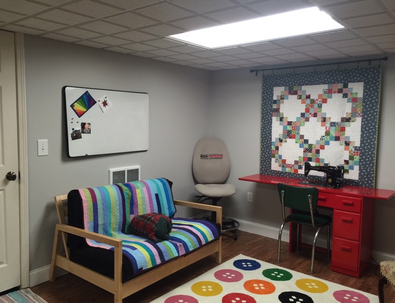 What a fabulous space to sew and create! The only way it could be better is if you were able to have natural daylight from some windows. Very impressive!