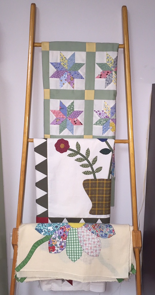 I also picked up a quilt ladder at a recent garage sale. It will do nicely to hold WIPs without having them moved out of sight.