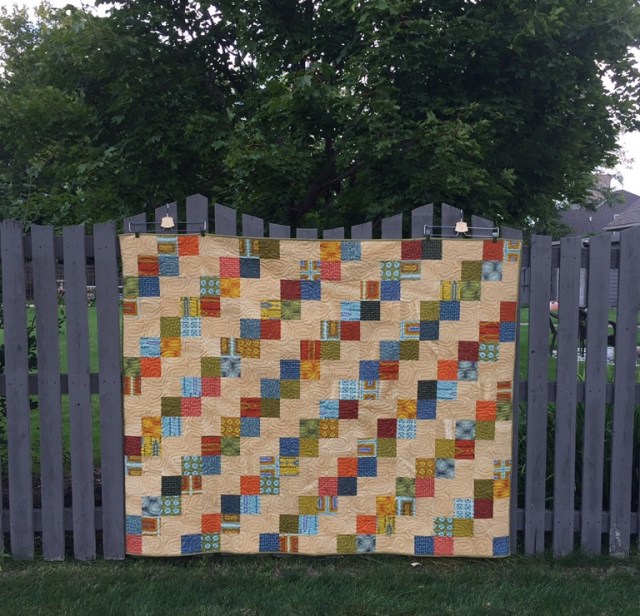 Beautiful quilt, Katy! The background color is just perfect with all those beautiful prints…and I love the backing and the quilting pattern you used. Looks like a cozy, snuggly quilt, for sure!!