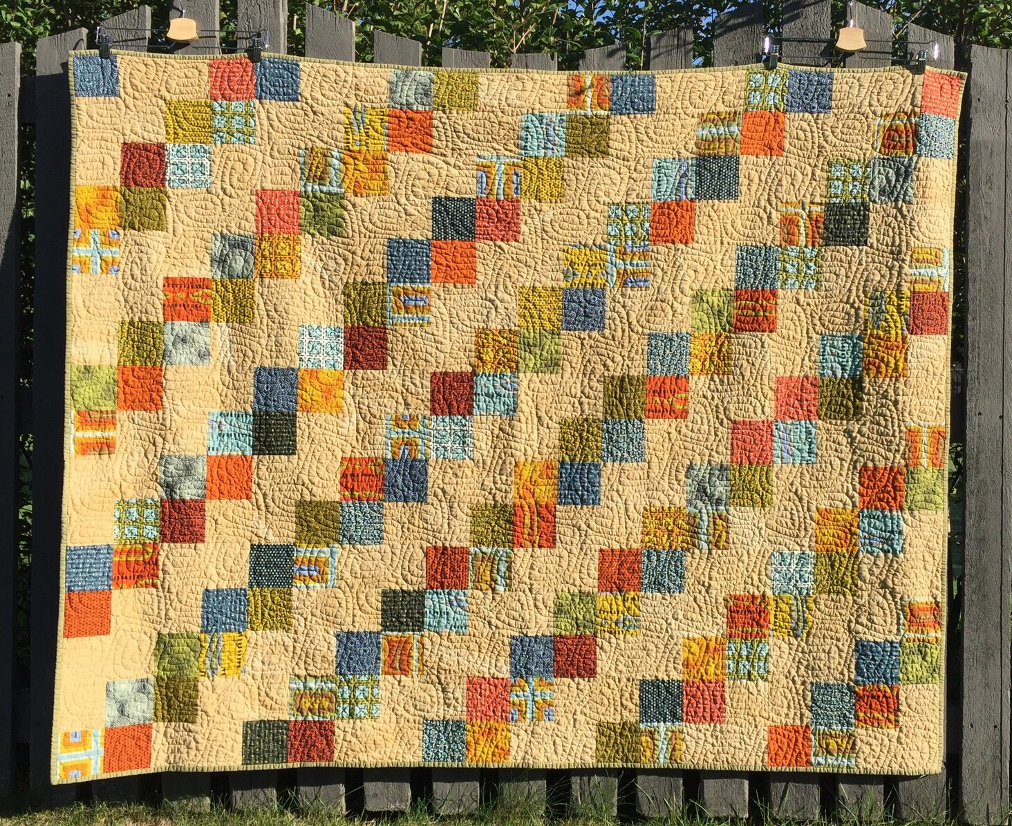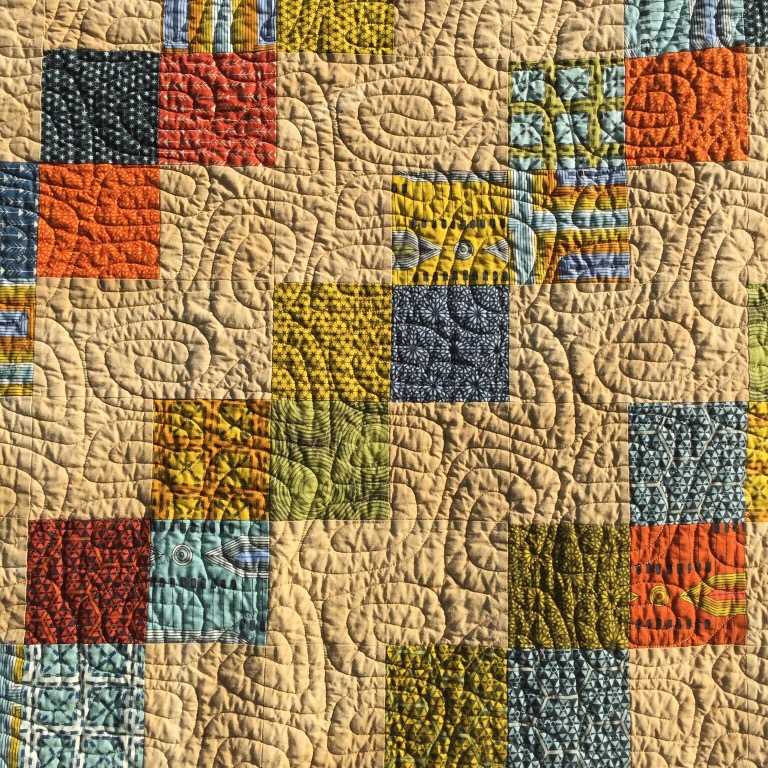 Beautiful quilt, Katy! The background color is just perfect with all those beautiful prints…and I love the backing and the quilting pattern you used. Looks like a cozy, snuggly quilt, for sure!!