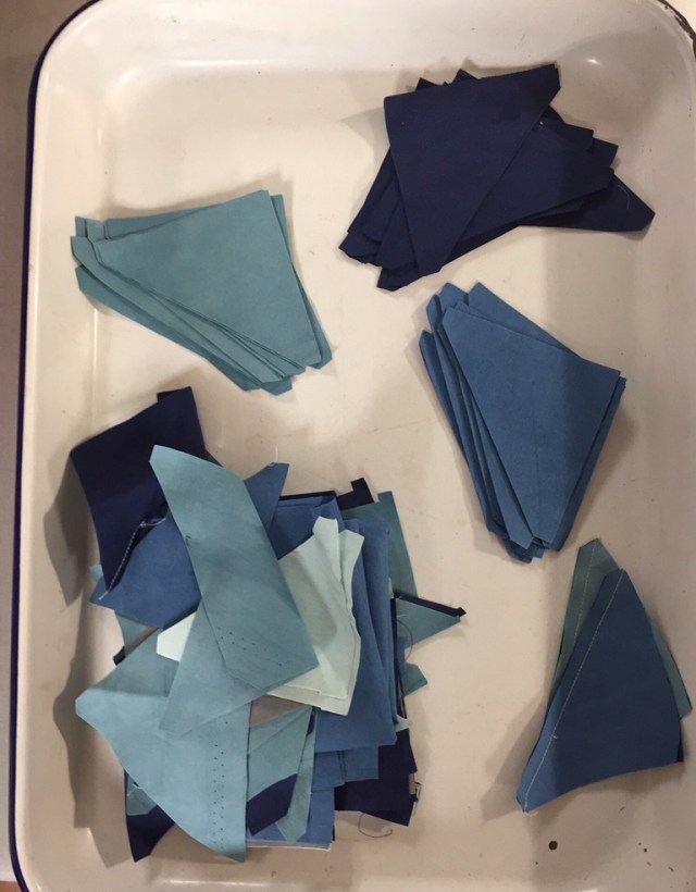 There are only 5 different shades of blue to work with so it is a bit of a trick to not have any like colors touching anywhere! I know, it could be a design element, but it isn’t what I am looking for. Out of the Gee’s Bend kit, these are all the pieces I have left over.