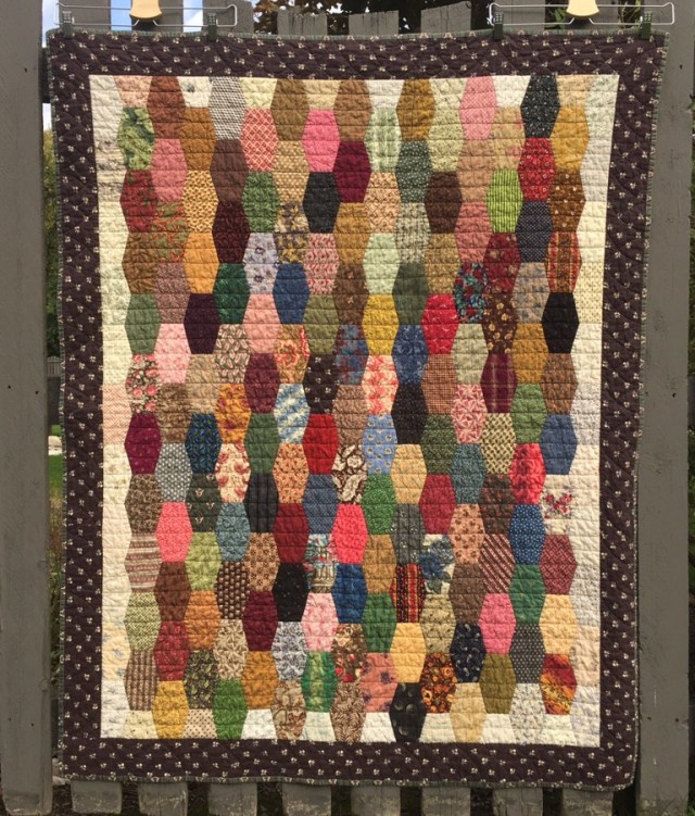 This next one is my very oldest hexie quilt! I remember making a template out of a plastic coffee can lid! It is hand pieced and hand quilted. It actually appeared in a magazine in the mid 1990s. You can tell my scrap stash was pretty weak at the time!