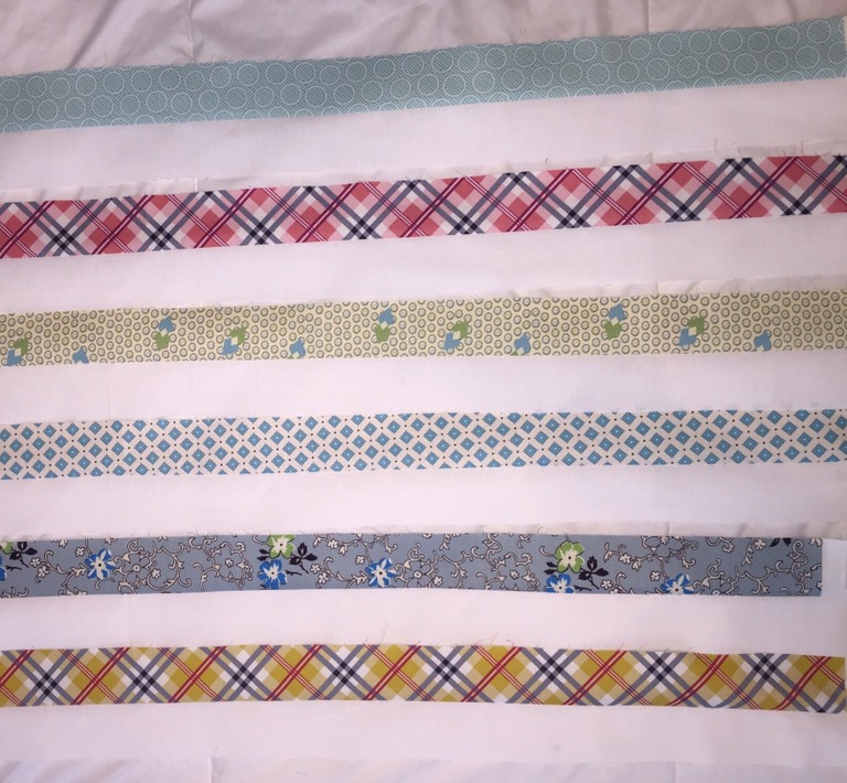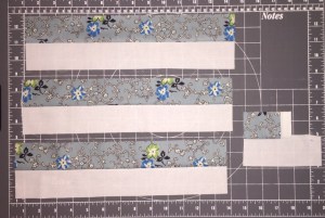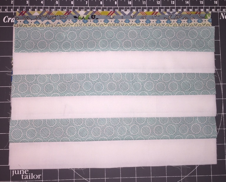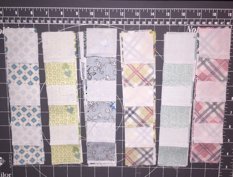 First, I sew a white strip to a print strip. I do 6 sets at a time. Then I sub cut those into 13 inch lengths.