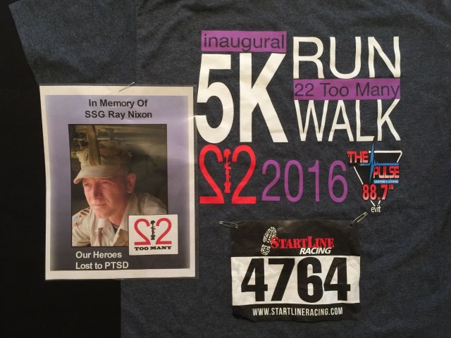 Every day in our country, we lose 22 veterans to suicide as a result of PTSD. That breaks my heart. The proceeds from this run benefit the 22 Too Many organization which seeks to help those who have given so much to our nation. Participants had photos pinned to their backs to run in honor of that person. This hero was the same rank as Daughter #2.