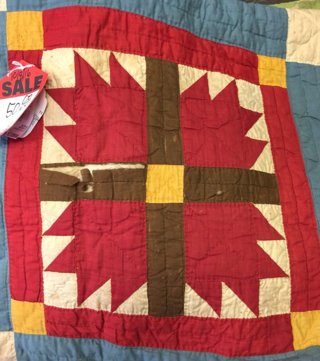 I took a break in the afternoon and checked out an antique store. I have seen very few vintage quilts out here, but this one had some interesting ones. This one was in great shape.