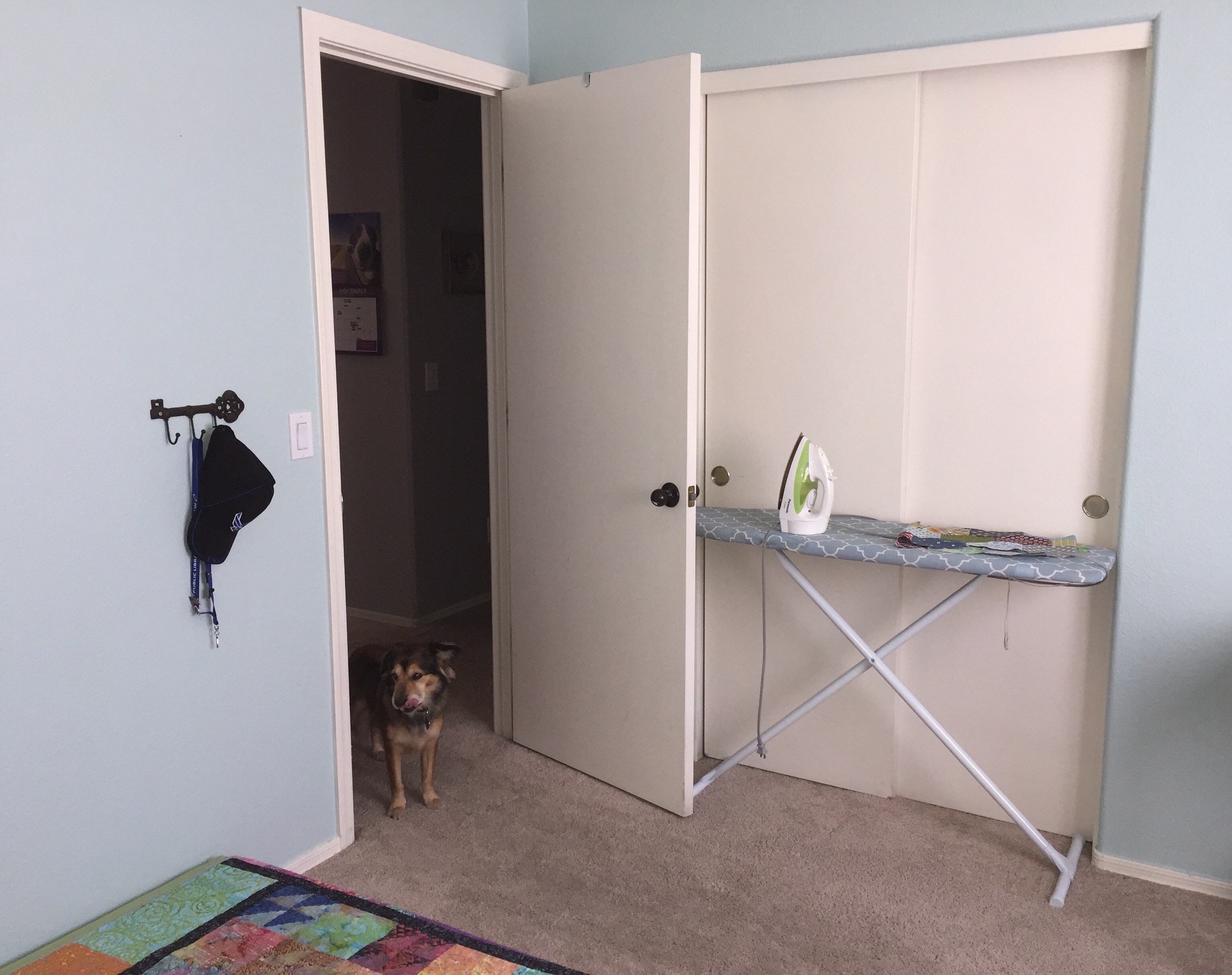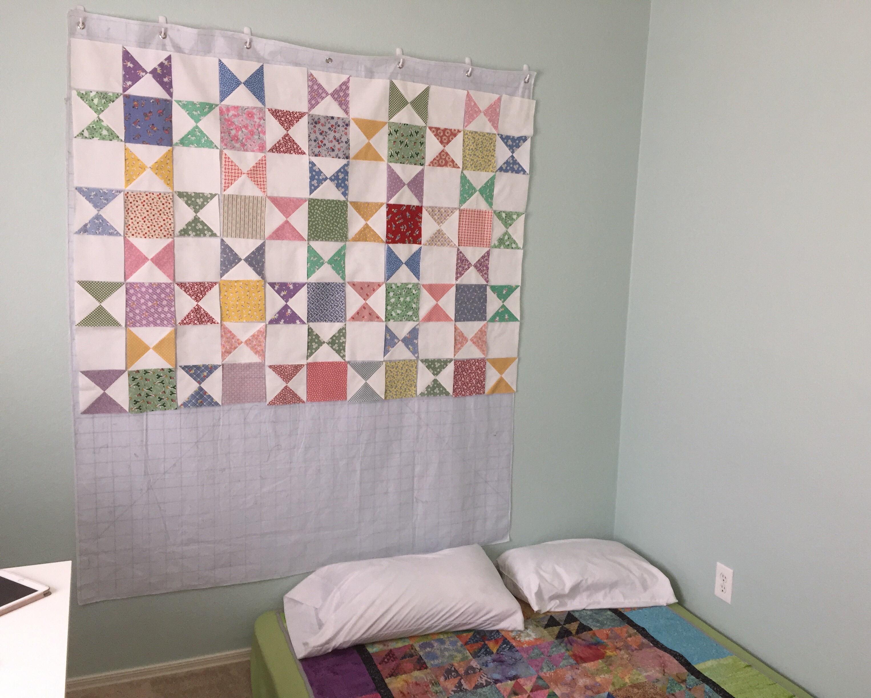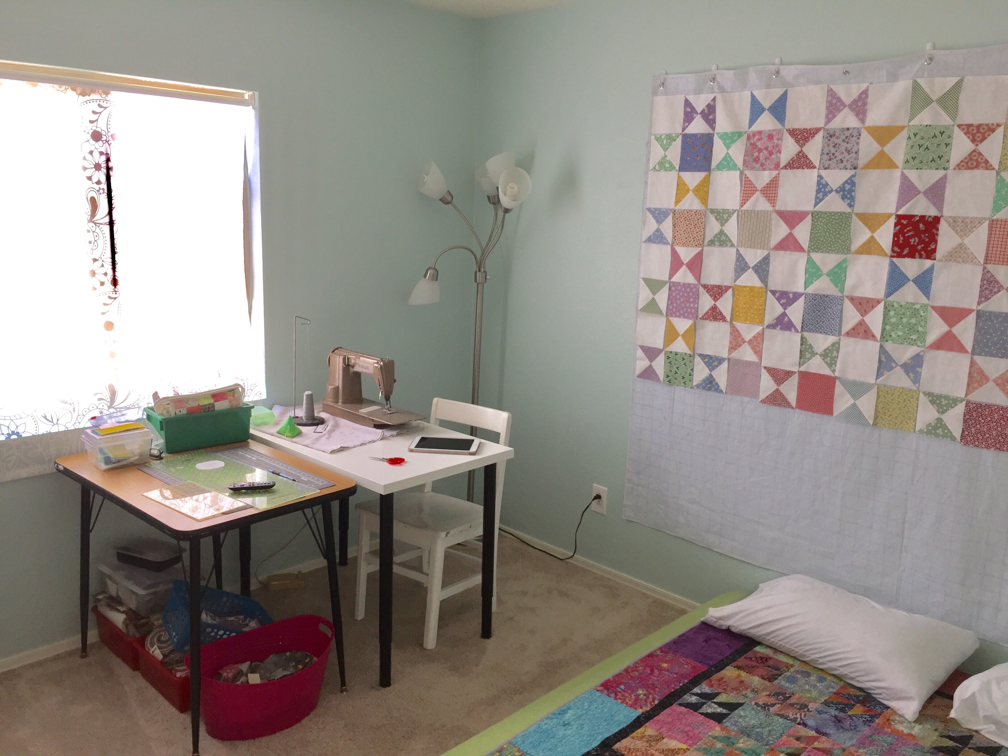 Katy.. your new digs look really comfy.. TV.. sewing machine… iron.. design wall… add nachos and you have it all.. Great quilt on the mattress… colorful and interesting design.