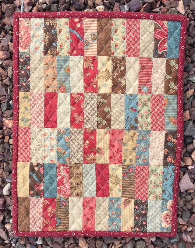 As I mentioned before, I had a plan for this charm pack, but I wasn’t happy with how it was turning out. So I moved on to Plan B. And here is my little finish before washing.