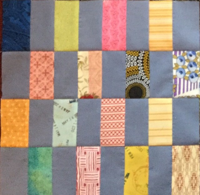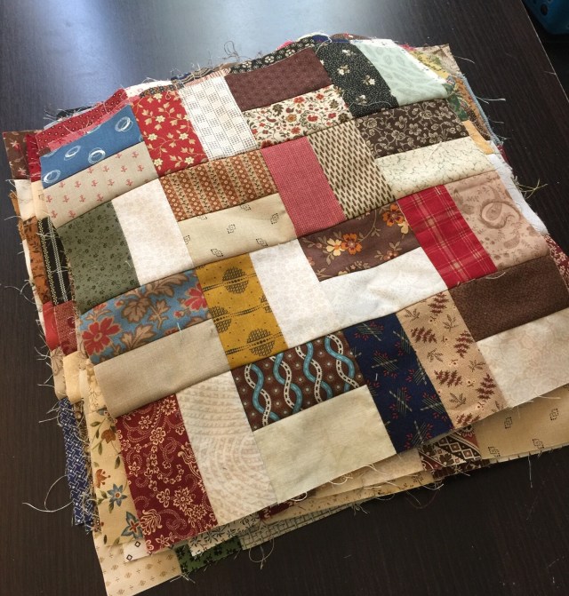 No Civil War fabrics there! In this case, I chose anything that was NOT Civil War repro fabric. This quilt was put together essentially the same way as the Fence Rail quilt. However, each block was pieced with all the rectangles in the same orientation.