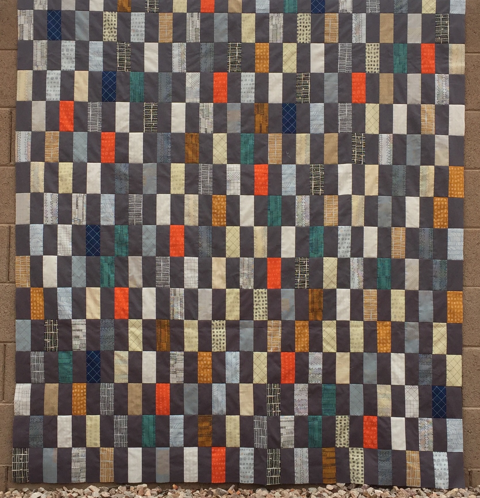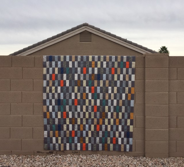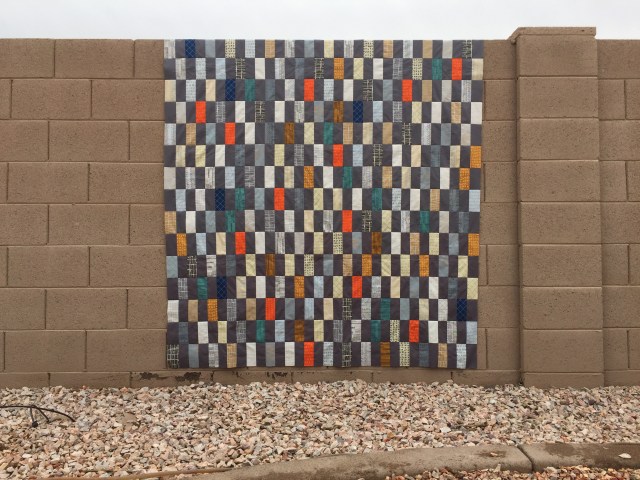 This turned out very pretty – love the placements of the orange – makes the quilt pop. Interesting on the darker background fabric, rather than an off white or tan.