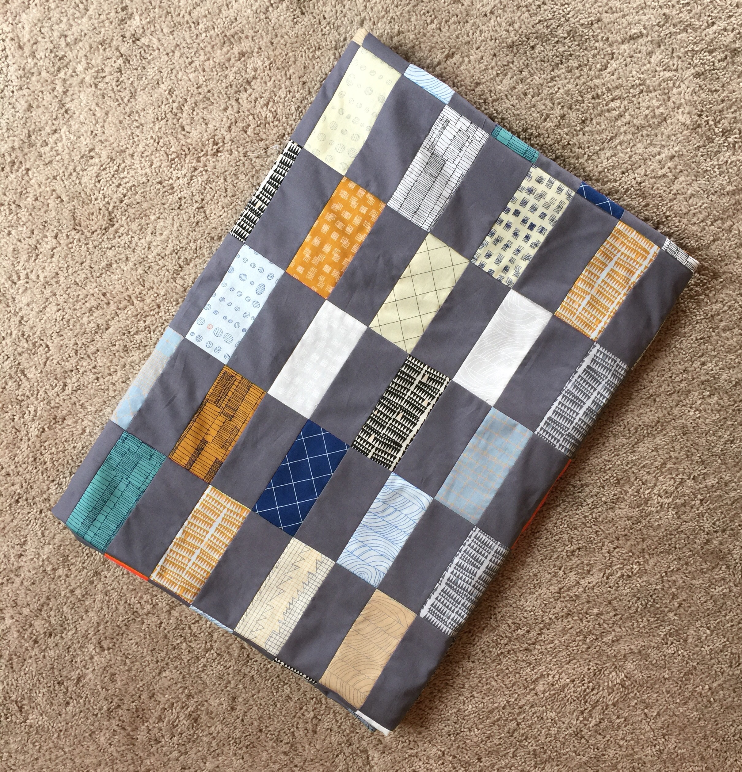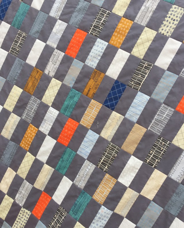 I really like that fabric line (Doe) and it works great for a guy quilt! I agree that the orange and turquoise really bring a pop to the quilt. Nice!