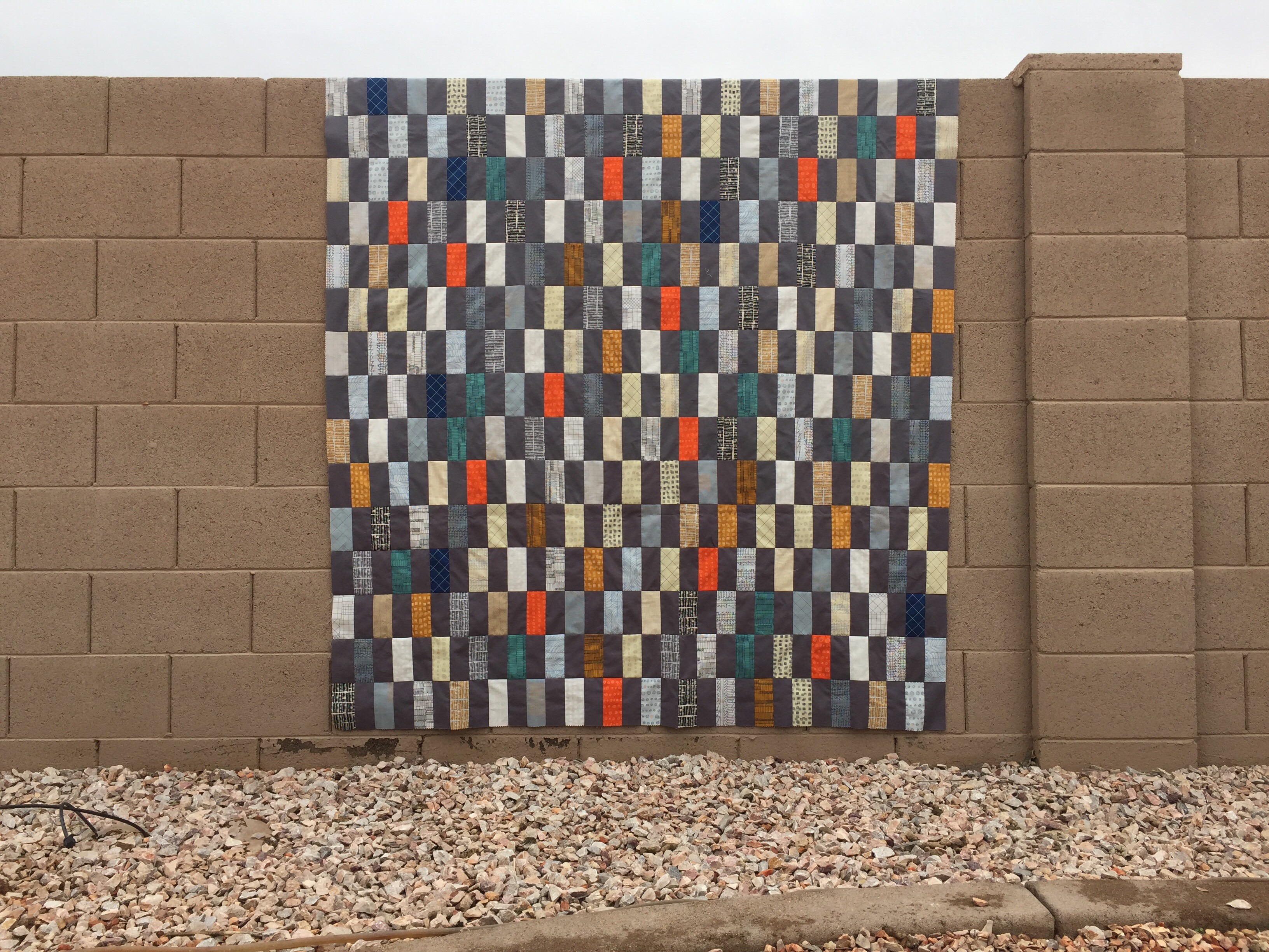 i really love your colors. The dark gray really makes it pop.It is so funny to see a quilt outside. Our weather in Wisconsin is cold, and sleety with frozen snow mounds on the ground.