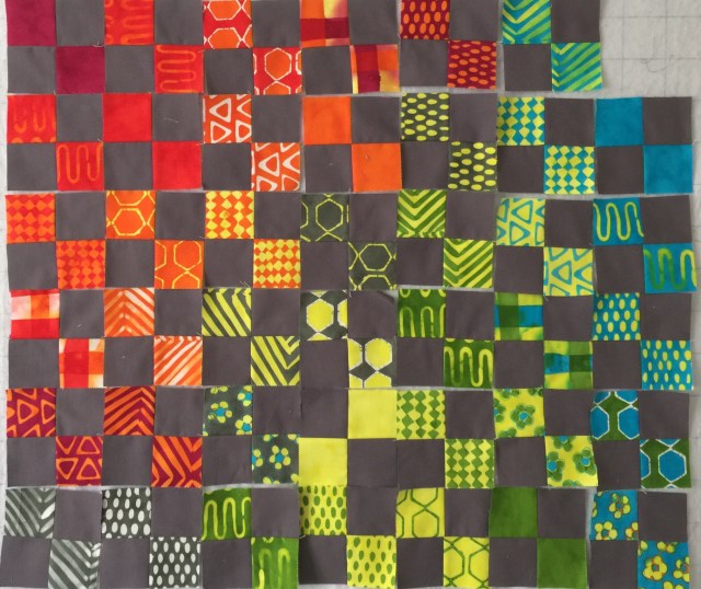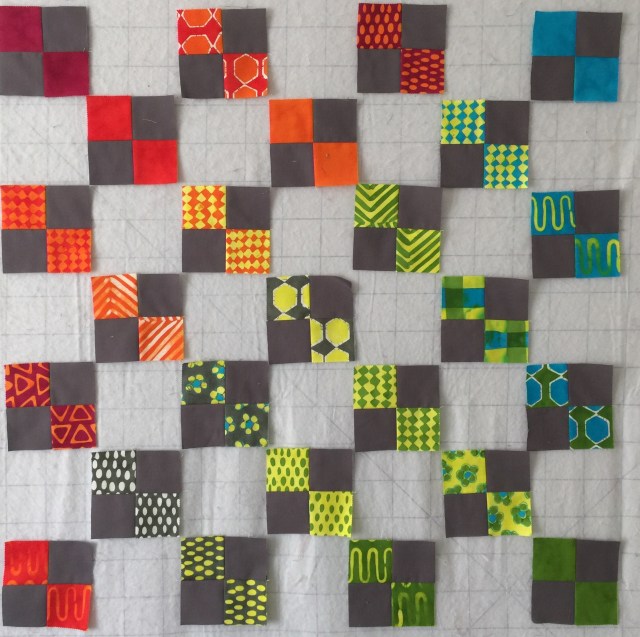 Such cute four-patches! The Kona grey really sets off the prints nicely. Looking forward to seeing how this project progresses.
