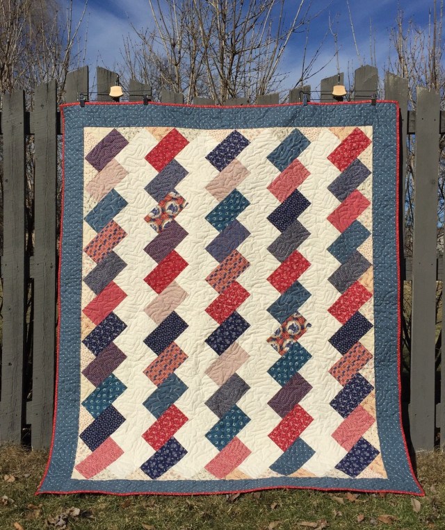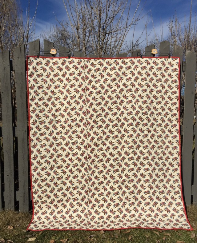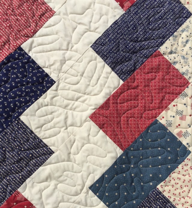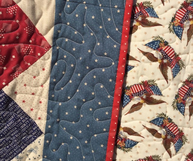 Lovely quilt! Liked it when you were piecing it in AZ, and I’m making a QOV using this pattern and a layer cake as well. What a great backing choice.