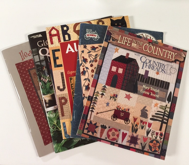 It’s time to fix this before the top grows any bigger. I’ve pulled out a few books that have some primitive appliqué designs to see if I can pull a few elements that I can add to this.