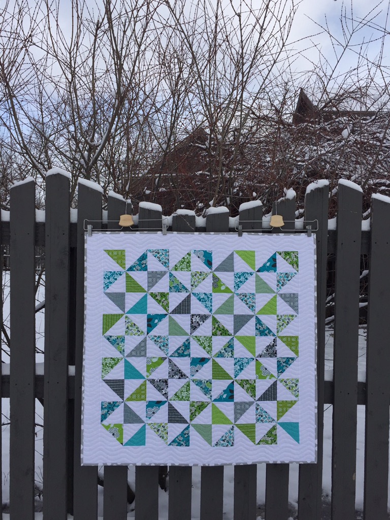 A lovely quilt, your colours are so pretty! And doesn’t it look wonderful outside in the snow, great photo!
