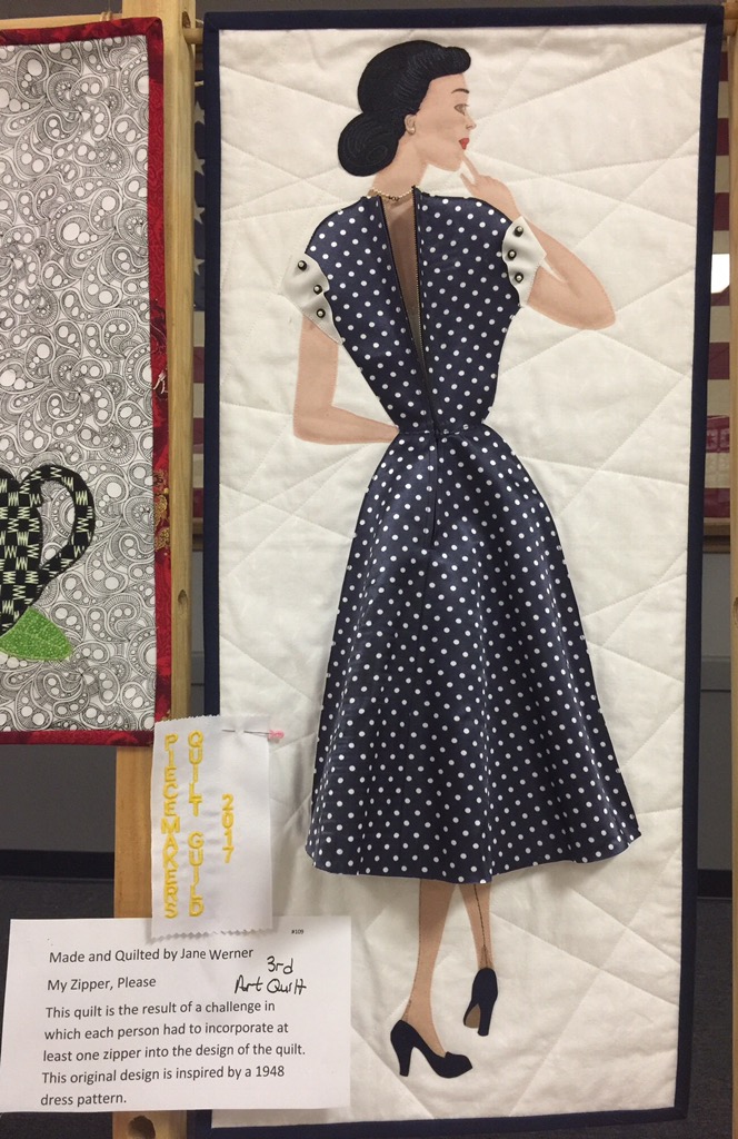 Thanks for showing your quilts. I love the one with the lady and the zipper. I reminds me the 50’s and 60’s when I was growing up.