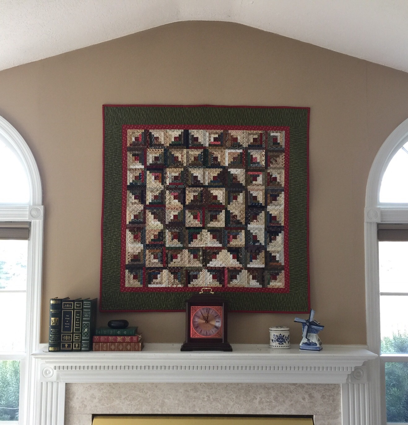 The current WIP is my house. I hung up some quilts in the family room. I hung my log cabin quilt over the fireplace.