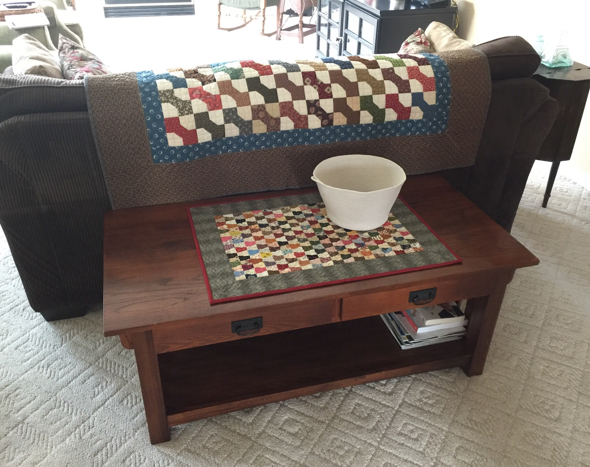 Love your living room with all your quilts. I really love your carpet it looks like you longarmed it!