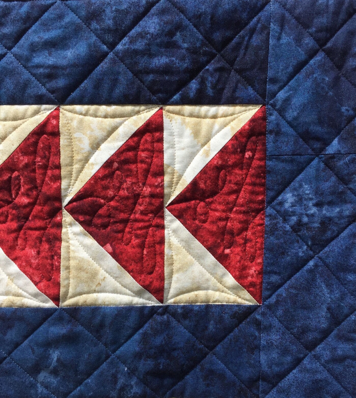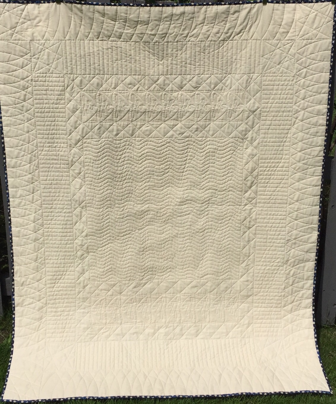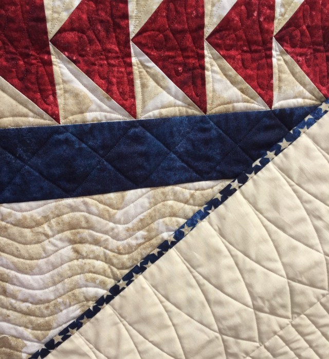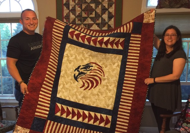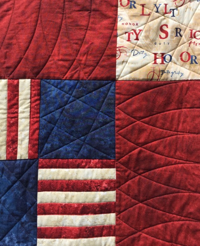 It is absolutely wonderful! I especially like the quilting you did for the center background, it is perfect. A prayer of thanks for your son’s service. God bless.