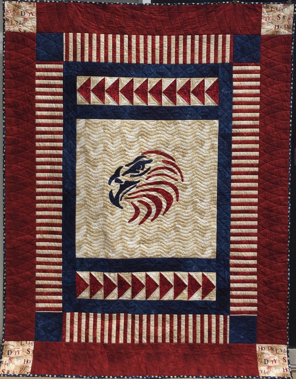The quilt is beautiful, and obviously, it is well received. I like your choice of the wavy lines across the eagle center.