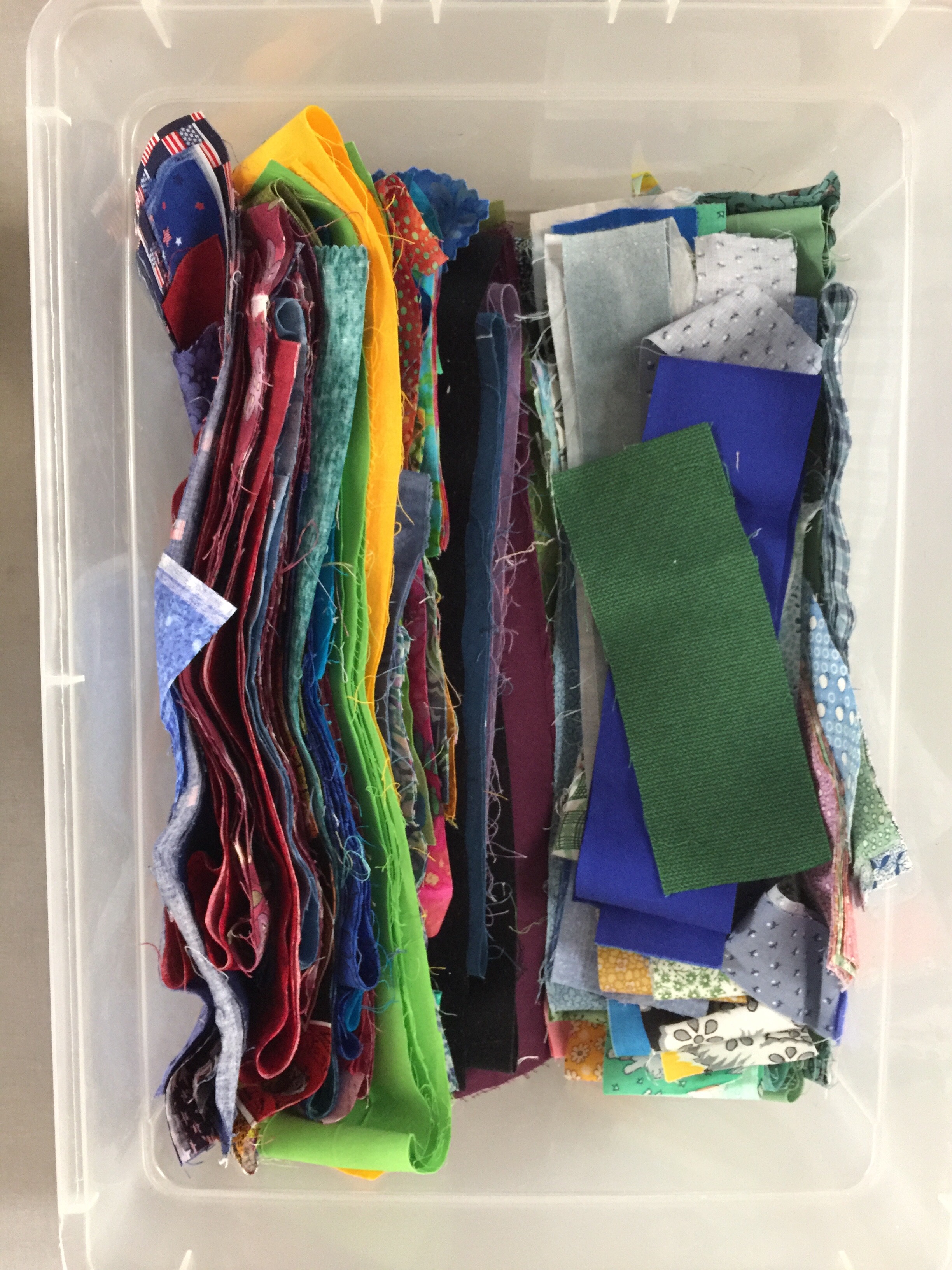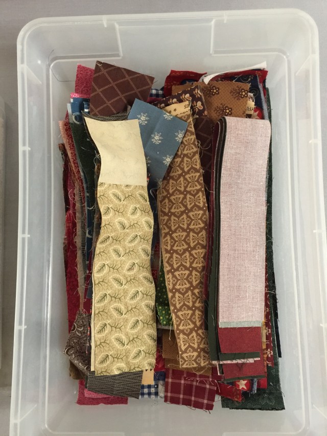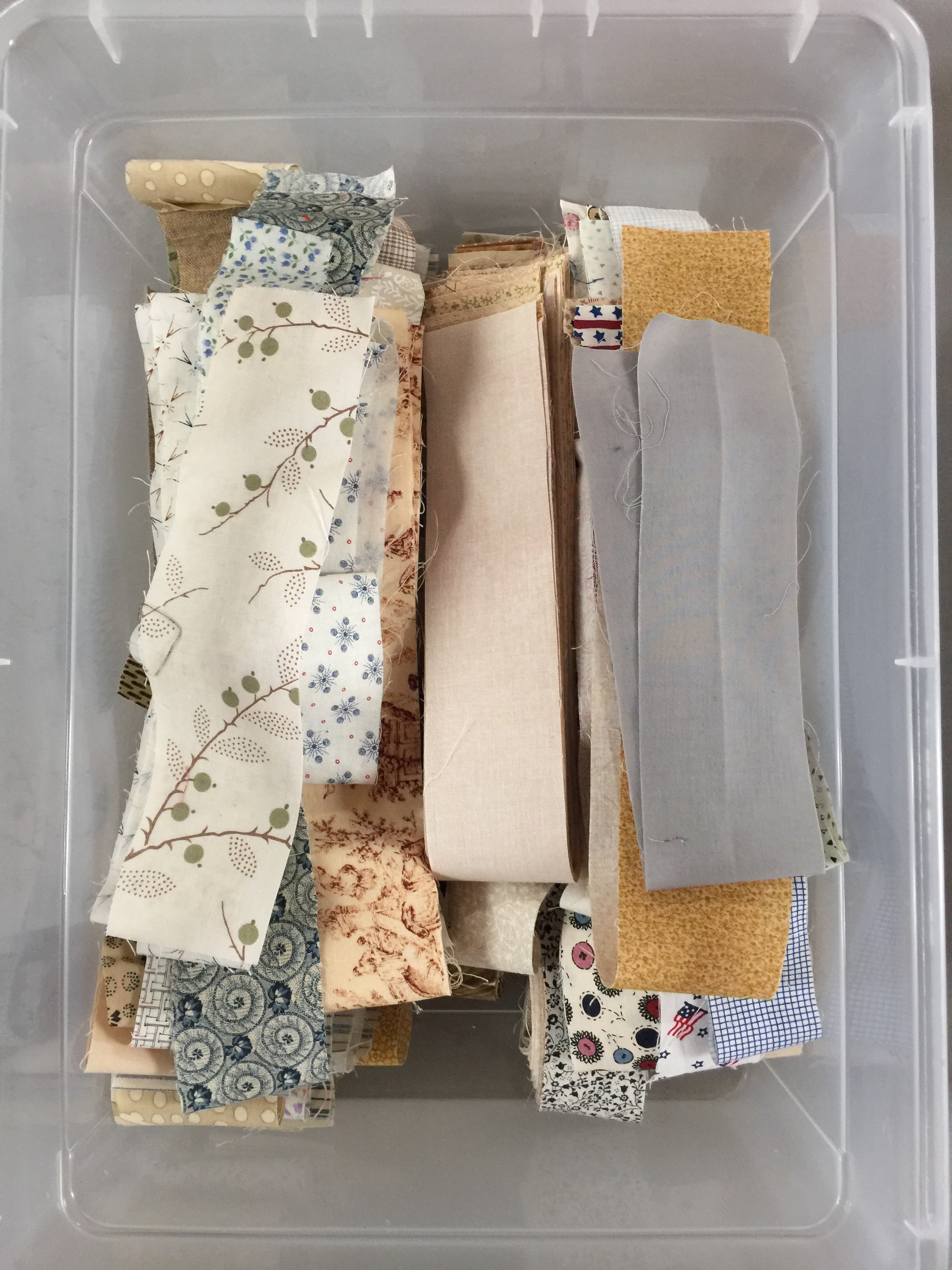 I ironed each piece and thought I would make one bin of strings/strips. My OCD wouldn’t allow me to put them all together. So my two bins ended up being three bins, Civil War, brights, and neutrals. I have two more huge containers of leftover binding strips to go through.