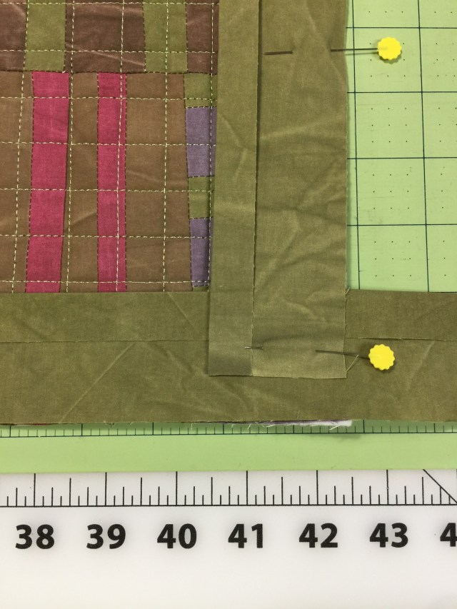 First I cut 2 1/2 inch strips and pressed under about a half inch along one side of each. I placed one on each of the shorter ends of the quilt, stretching the facing strip slightly and pinning as I went. You can see that I didn’t measure, just left them a little long. Next I stretched slightly and pinned the two strips on the long sides. I did trim these ends just a little short as you can see below.